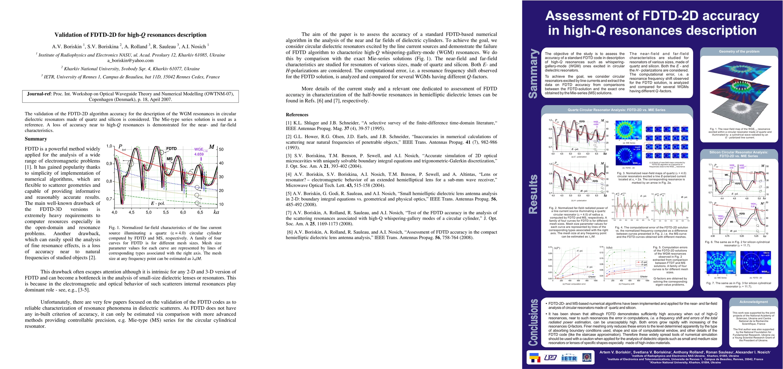 The objective of the study is to assess the accuracy of a standard FDTD code in description of high-Q resonances such as whispering-gallery-mode (WGM) ones excited in circular dielectric resonators. To achieve the goal, we consider circular resonators excited by line currents and extract the data on FDTD accuracy from comparisons between the FDTD-solution and the exact one obtained by the Mie-series solutions. The near-field and far-field characteristics are studied for resonators of various sizes, made of quartz and silicon. Both E - and H - polarizations are considered. The computational error, i.e. a resonance frequency shift observed for the FDTD solution, is analyzed and compared for several WGMs having different Q-factors.
