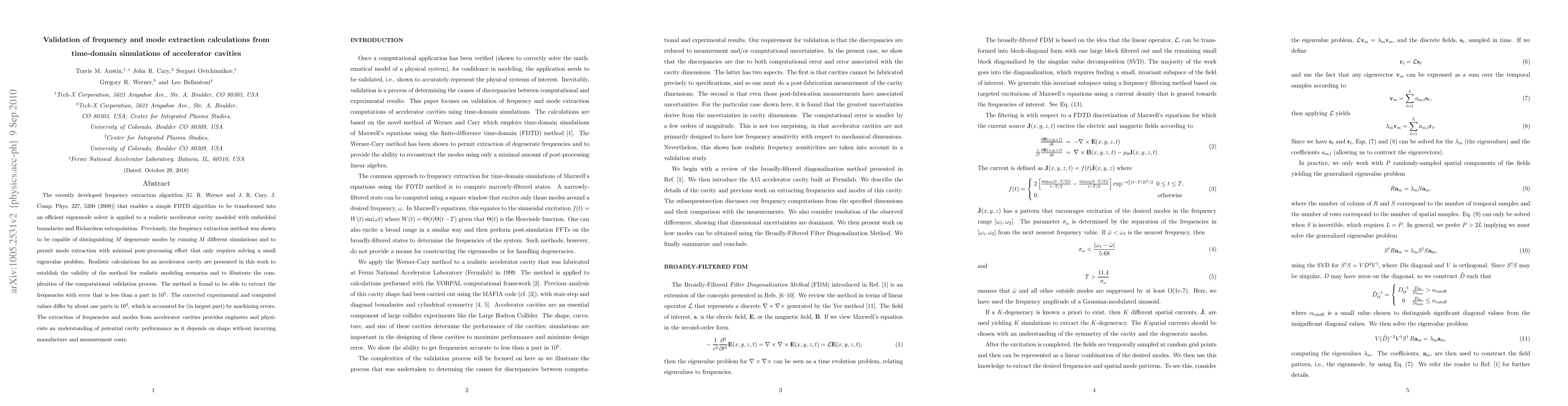 The recently developed frequency extraction algorithm [G.R. Werner and J.R. Cary, J. Comp. Phys. 227, 5200 (2008)] that enables a simple FDTD algorithm to be transformed into an efficient eigenmode solver is applied to a realistic accelerator cavity modeled with embedded boundaries and Richardson extrapolation. Previously, the frequency extraction method was shown to be capable of distinguishing M degenerate modes by running M different simulations and to permit mode extraction with minimal post-processing effort that only requires solving a small eigenvalue problem. Realistic calculations for an accelerator cavity are presented in this work to establish the validity of the method for realistic modeling scenarios and to illustrate the complexities of the computational validation process. The method is found to be able to extract the frequencies with error that is less than a part in 10^5. The corrected experimental and computed values differ by about one parts in 10^$, which is accounted for (in largest part) by machining errors. The extraction of frequencies and modes from accelerator cavities provides engineers and physicists an understanding of potential cavity performance as it depends on shape without incurring manufacture and measurement costs.