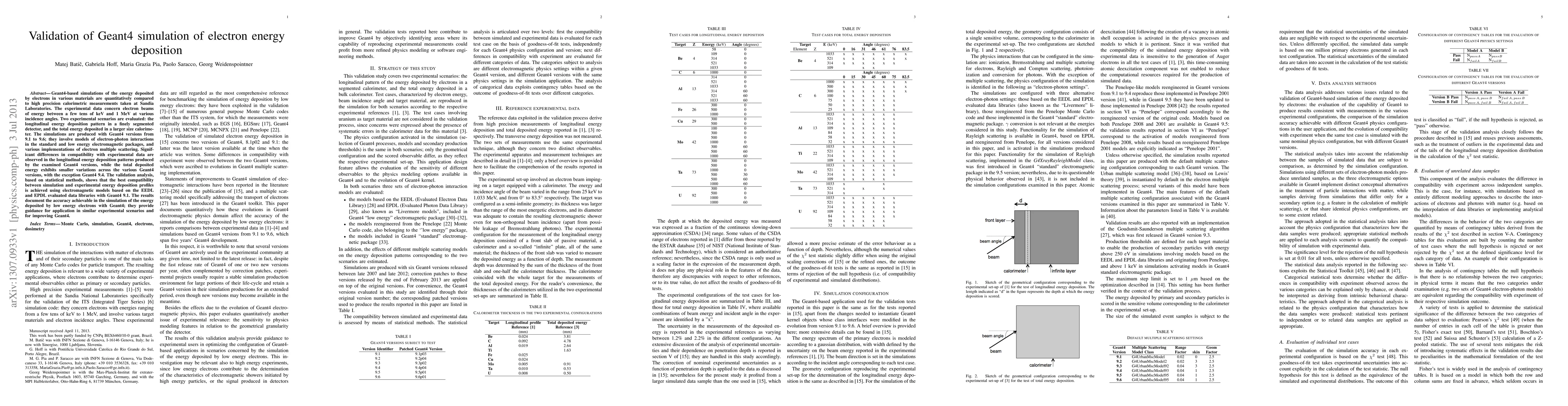 The paper presents a detailed validation of Geant4's electromagnetic models for simulating electron energy deposition, focusing on the impact of different versions, electron-photon interaction models, and multiple scattering settings.