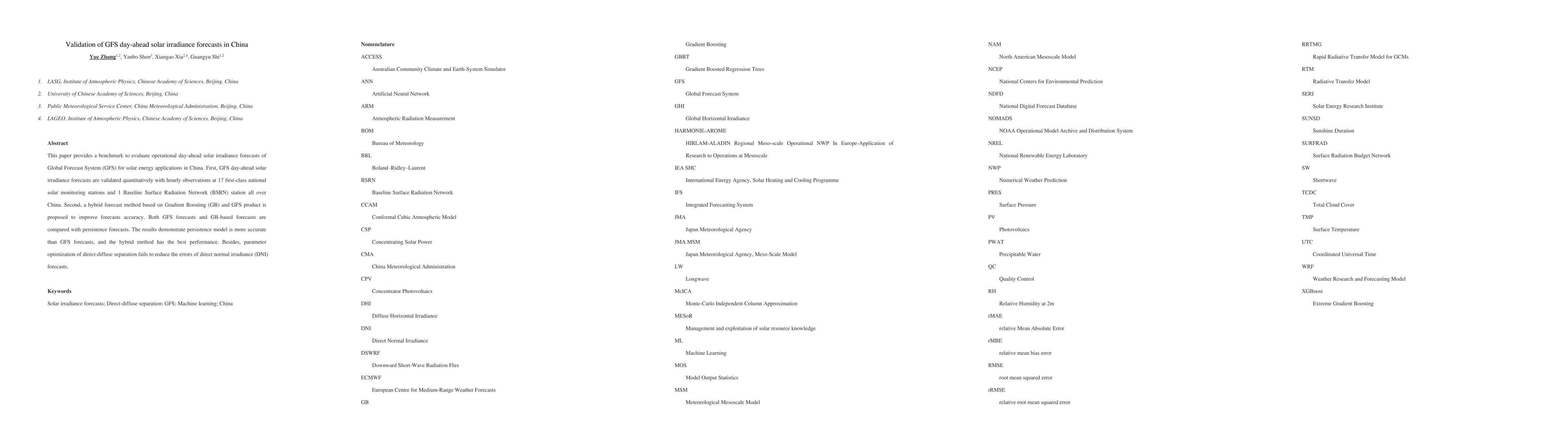 This paper validates GFS day-ahead solar irradiance forecasts in China against observations and proposes a hybrid GB-GFS method to improve accuracy, showing the hybrid method outperforms both GFS and persistence forecasts, while direct-diffuse separation optimization does not reduce DNI forecast errors.