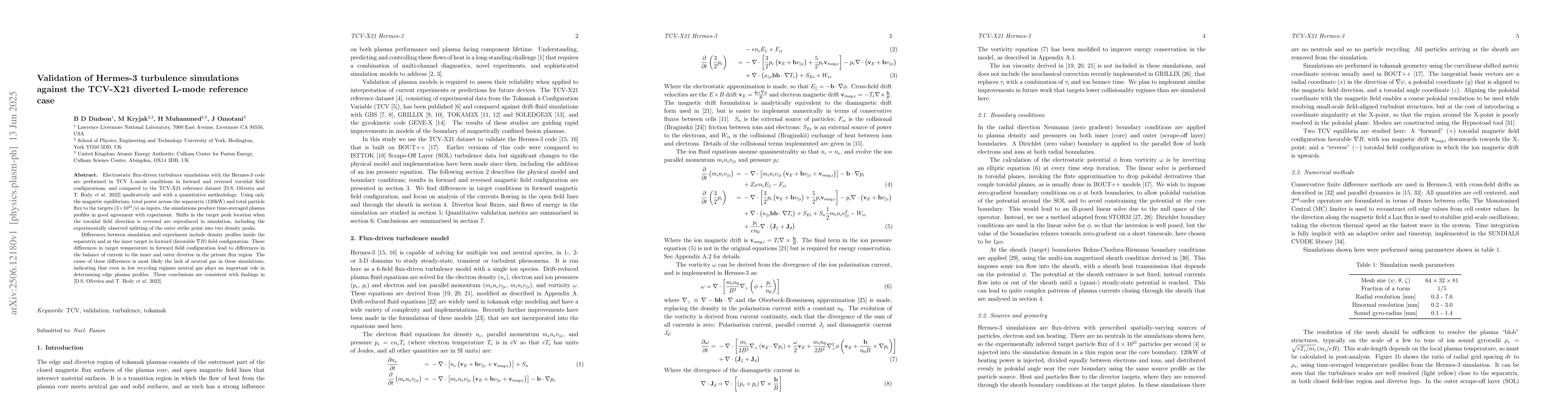 Electrostatic flux-driven turbulence simulations with the Hermes-3 code are performed in TCV L-mode conditions in forward and reversed toroidal field configurations, and compared to the TCV-X21 reference dataset [D.S. Oliveira and T. Body et al. 2022] qualitatively and with a quantitative methodology. Using only the magnetic equilibrium, total power across the separatrix (120kW) and total particle flux to the targets (3e21/s) as inputs, the simulations produce time-averaged plasma profiles in good agreement with experiment. Shifts in the target peak location when the toroidal field direction is reversed are reproduced in simulation, including the experimentally observed splitting of the outer strike point into two density peaks. Differences between simulation and experiment include density profiles inside the separatrix and at the inner target in forward (favorable Grad-B) field configuration. These differences in target temperature in forward field configuration lead to differences in the balance of current to the inner and outer divertor in the private flux region. The cause of these differences is most likely the lack of neutral gas in these simulations, indicating that even in low recycling regimes neutral gas plays an important role in determining edge plasma profiles. These conclusions are consistent with findings in [D.S. Oliveira and T. Body et al. 2022].