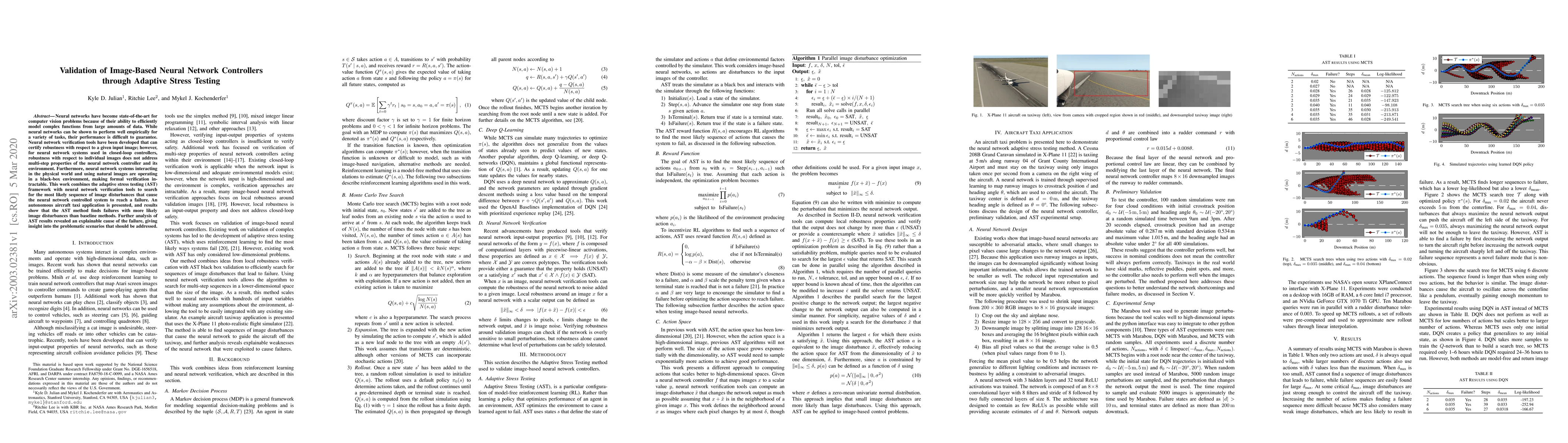 This paper validates image-based neural network controllers using adaptive stress testing to identify failure-inducing sequences of image disturbances, demonstrating improved failure detection over baseline methods in an autonomous aircraft taxi application. The method also provides insights into problematic scenarios for controller improvement.