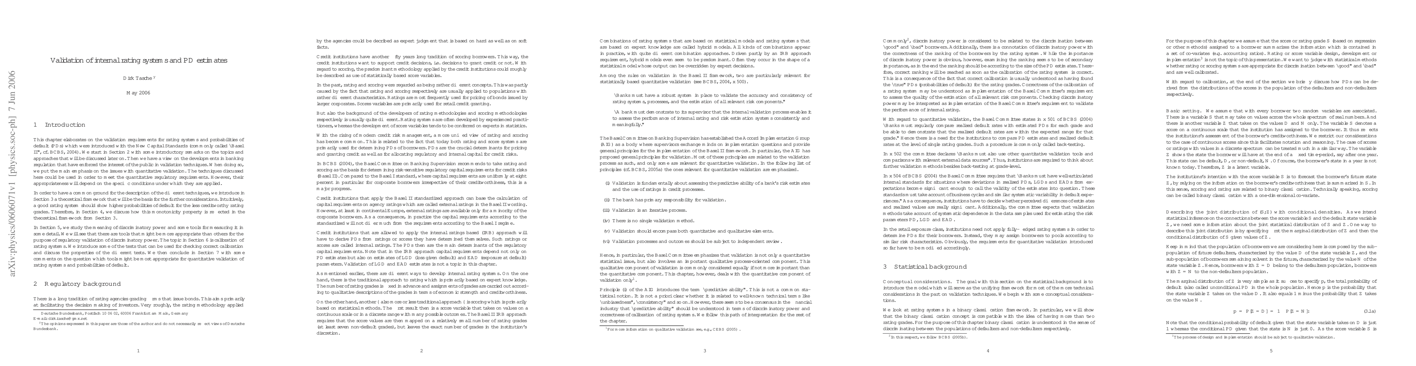 This paper validates internal rating systems and probabilities of default to ensure they meet regulatory requirements, focusing on quantitative validation techniques and tools for measuring discriminatory power.