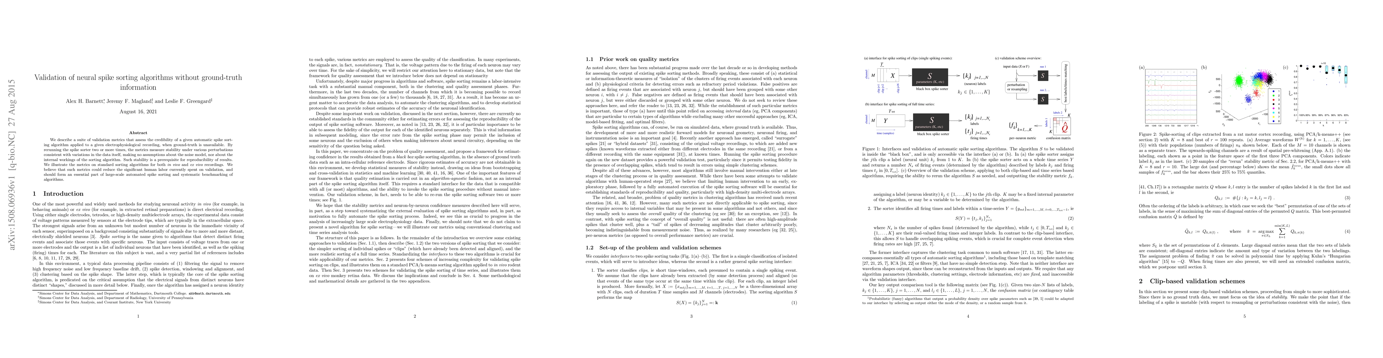 This paper introduces validation metrics for assessing the credibility of automatic spike sorting algorithms without ground-truth data, focusing on stability under data perturbations. These metrics aim to reduce human labor and enhance reproducibility in large-scale automated spike sorting.