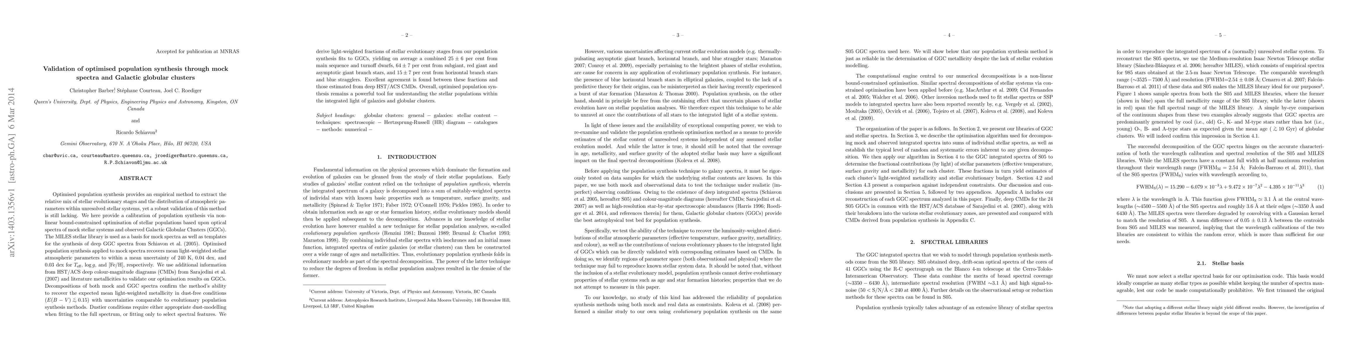 This paper validates optimised population synthesis through mock spectra and Galactic globular clusters, showing it can recover mean light-weighted stellar parameters with uncertainties of 240 K, 0.04 dex, and 0.03 dex for T_eff, log(g), and [Fe/H] respectively. The method also accurately estimates the fractions of different stellar evolutionary stages in globular clusters, aligning well with HST/ACS CMD estimates.