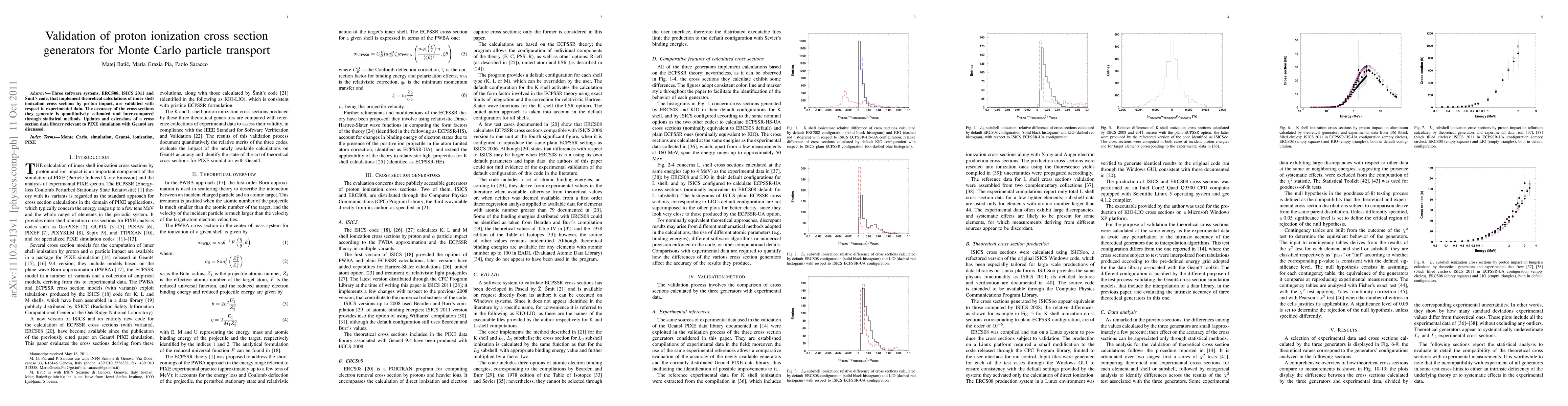 Three software systems, ERCS08, ISICS 2011 and \v{S}mit's code, that implement theoretical calculations of inner shell ionization cross sections by proton impact, are validated with respect to experimental data. The accuracy of the cross sections they generate is quantitatively estimated and inter-compared through statistical methods. Updates and extensions of a cross section data library relevant to PIXE simulation with Geant4 are discussed.