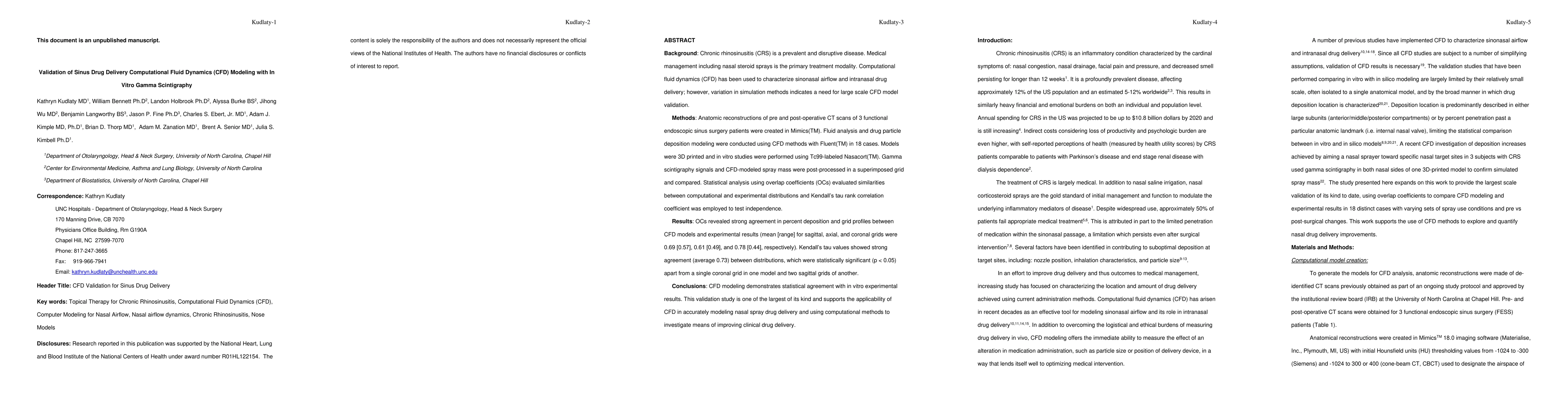 This study validates computational fluid dynamics (CFD) modeling of nasal spray drug delivery using in vitro gamma scintigraphy, showing strong agreement between CFD predictions and experimental results, thus supporting CFD's use in optimizing sinonasal drug delivery methods.