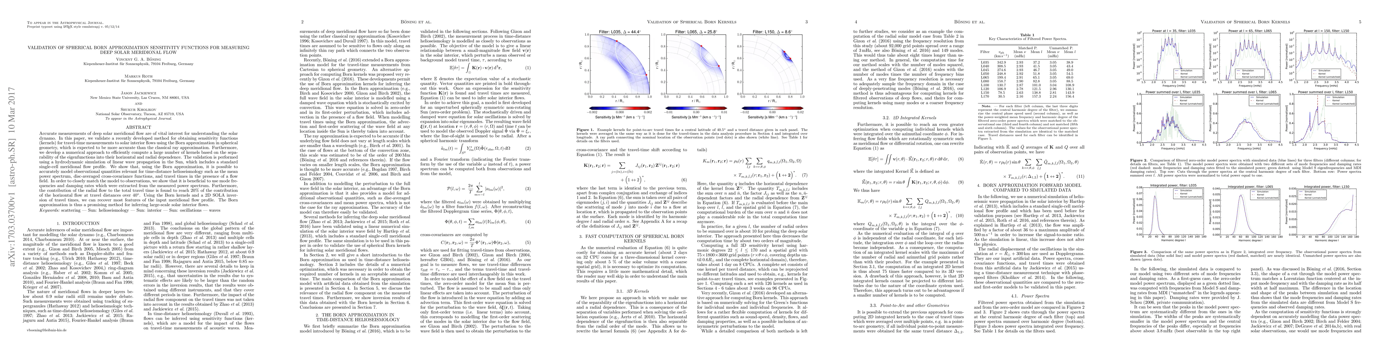 Accurate measurements of deep solar meridional flow are of vital interest for understanding the solar dynamo. In this paper, we validate a recently developed method for obtaining sensitivity functions (kernels) for travel-time measurements to solar interior flows using the Born approximation in spherical geometry, which is expected to be more accurate than the classical ray approximation. Furthermore, we develop a numerical approach to efficiently compute a large number of kernels based on the separability of the eigenfunctions into their horizontal and radial dependence. The validation is performed using a hydrodynamic simulation of linear wave propagation in the Sun, which includes a standard single-cell meridional flow profile. We show that, using the Born approximation, it is possible to accurately model observational quantities relevant for time-distance helioseismology such as the mean power spectrum, disc-averaged cross-covariance functions, and travel times in the presence of a flow field. In order to closely match the model to observations, we show that it is beneficial to use mode frequencies and damping rates which were extracted from the measured power spectrum. Furthermore, the contribution of the radial flow to the total travel time is found to reach 20% of the contribution of the horizontal flow at travel distances over $40^\circ$. Using the Born kernels and a 2D SOLA inversion of travel times, we can recover most features of the input meridional flow profile. The Born approximation is thus a promising method for inferring large-scale solar interior flows.