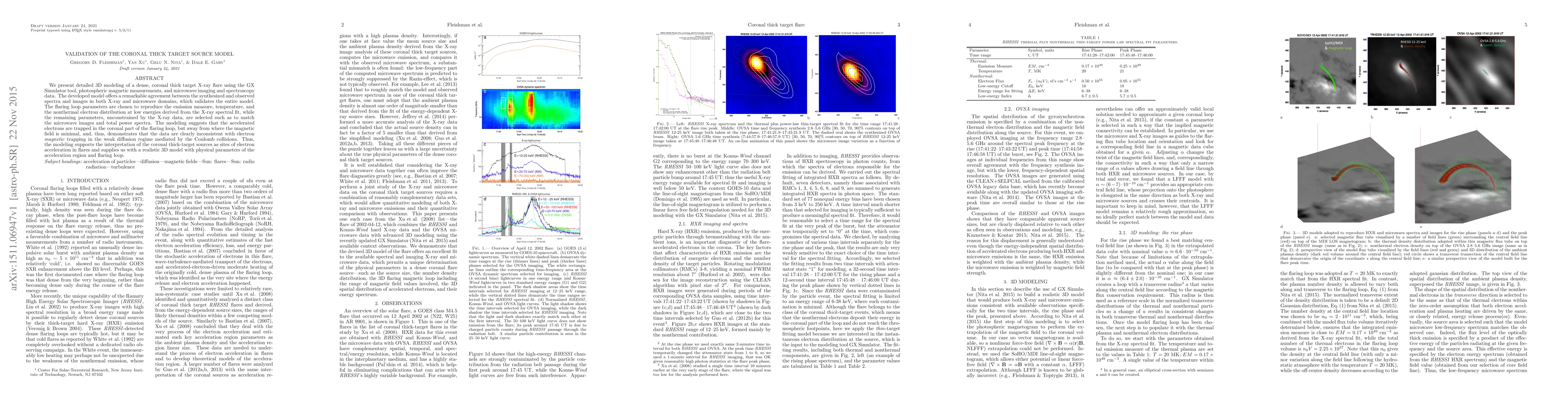 We present detailed 3D modeling of a dense, coronal thick target X-ray flare using the GX Simulator tool, photospheric magnetic measurements, and microwave imaging and spectroscopy data. The developed model offers a remarkable agreement between the synthesized and observed spectra and images in both X-ray and microwave domains, which validates the entire model. The flaring loop parameters are chosen to reproduce the emission measure, temperature, and the nonthermal electron distribution at low energies derived from the X-ray spectral fit, while the remaining parameters, unconstrained by the X-ray data, are selected such as to match the microwave images and total power spectra. The modeling suggests that the accelerated electrons are trapped in the coronal part of the flaring loop, but away from where the magnetic field is minimal, and, thus, demonstrates that the data are clearly inconsistent with electron magnetic trapping in the weak diffusion regime mediated by the Coulomb collisions. Thus, the modeling supports the interpretation of the coronal thick-target sources as sites of electron acceleration in flares and supplies us with a realistic 3D model with physical parameters of the acceleration region and flaring loop.