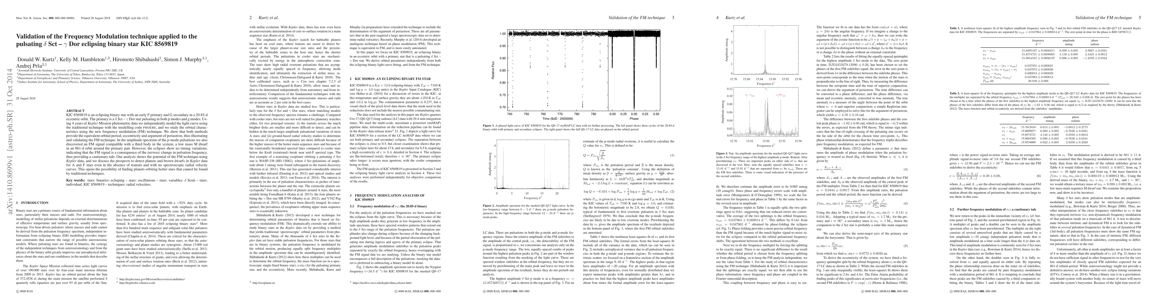 KIC 8569819 is an eclipsing binary star with an early F primary and G secondary in a 20.85-d eccentric orbit. The primary is a delta Sct - gamma Dor star pulsating in both p modes and g modes. Using 4 years of Kepler Mission photometric data we independently model the light curve using the traditional technique with the modelling code PHOEBE, and we study the orbital characteristics using the new frequency modulation (FM) technique. We show that both methods provide the equivalent orbital period, eccentricity and argument of periastron, thus illustrating and validating the FM technique. In the amplitude spectrum of the p-mode pulsations we also discovered an FM signal compatible with a third body in the system, a low mass M dwarf in an 861-d orbit around the primary pair. However, the eclipses show no timing variations, indicating that the FM signal is a consequence of the intrinsic change in pulsation frequency, thus providing a cautionary tale. Our analysis shows the potential of the FM technique using {\it Kepler} data, and we discuss the prospects to detect planets and brown dwarfs in Kepler data for A and F stars even in the absence of transits and with no spectroscopic radial velocity curves. This opens the possibility of finding planets orbiting hotter stars that cannot be found by traditional techniques.