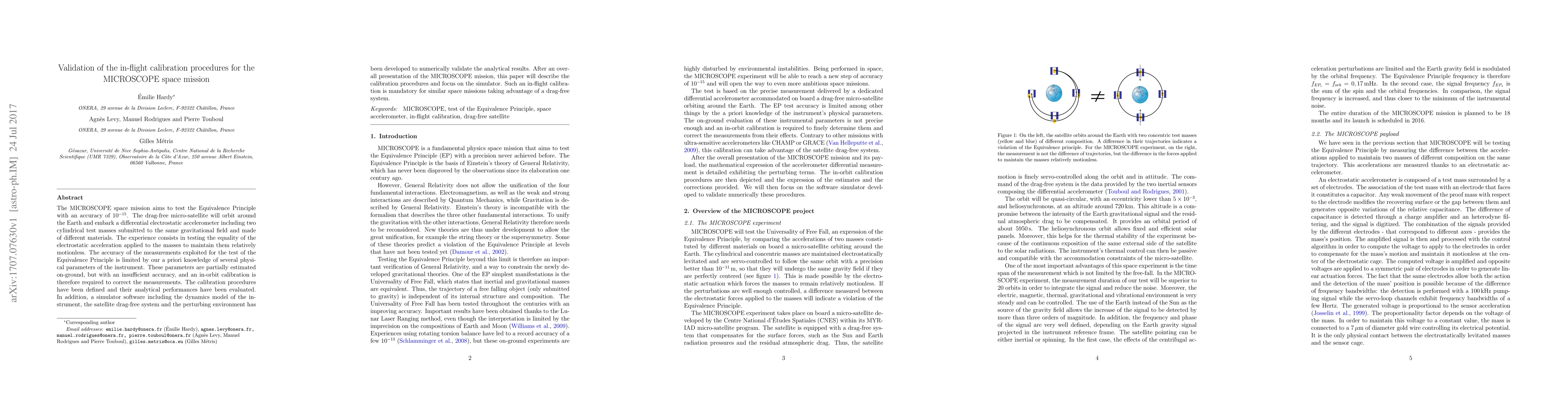 The MICROSCOPE space mission aims to test the Equivalence Principle with high accuracy, requiring in-flight calibration procedures to correct measurement errors. A simulator software has been developed to numerically validate these procedures.
