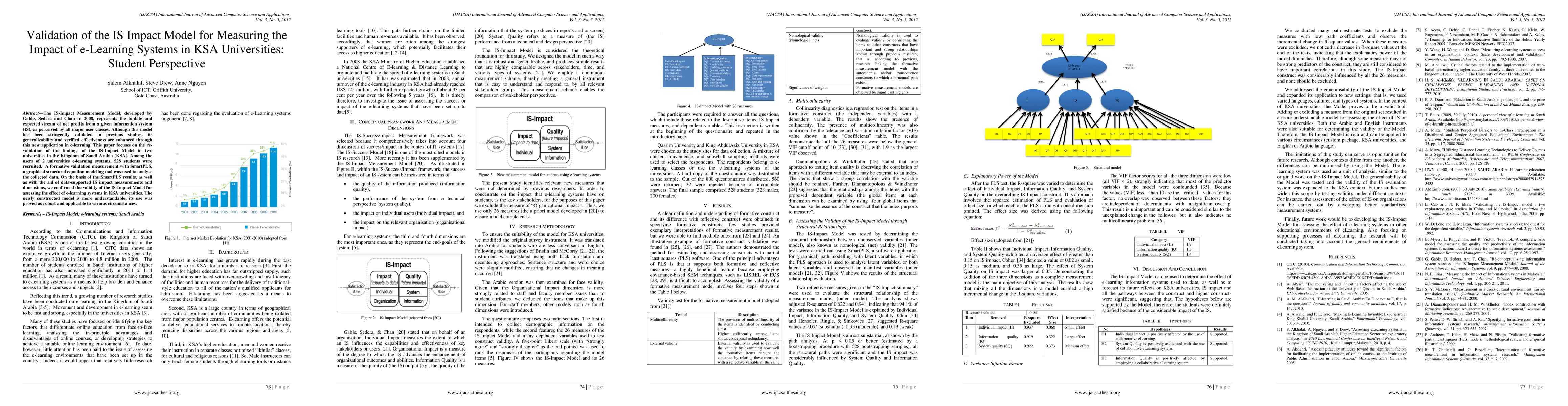 The IS-Impact Measurement Model, developed by Gable, Sedera and Chan in 2008, represents the to-date and expected stream of net profits from a given information system (IS), as perceived by all major user classes. Although this model has been stringently validated in previous studies, its generalizability and verified effectiveness are enhanced through this new application in e-learning. This paper focuses on the re-validation of the findings of the IS-Impact Model in two universities in the Kingdom of Saudi Arabia (KSA). Among the users of 2 universities e-learning systems, 528 students were recruited. A formative validation measurement with SmartPLS, a graphical structural equation modeling tool was used to analyse the collected data. On the basis of the SmartPLS results, as well as with the aid of data-supported IS impact measurements and dimensions, we confirmed the validity of the IS-Impact Model for assessing the effect of e-learning systems in KSA universities. The newly constructed model is more understandable, its use was proved as robust and applicable to various circumstances.
