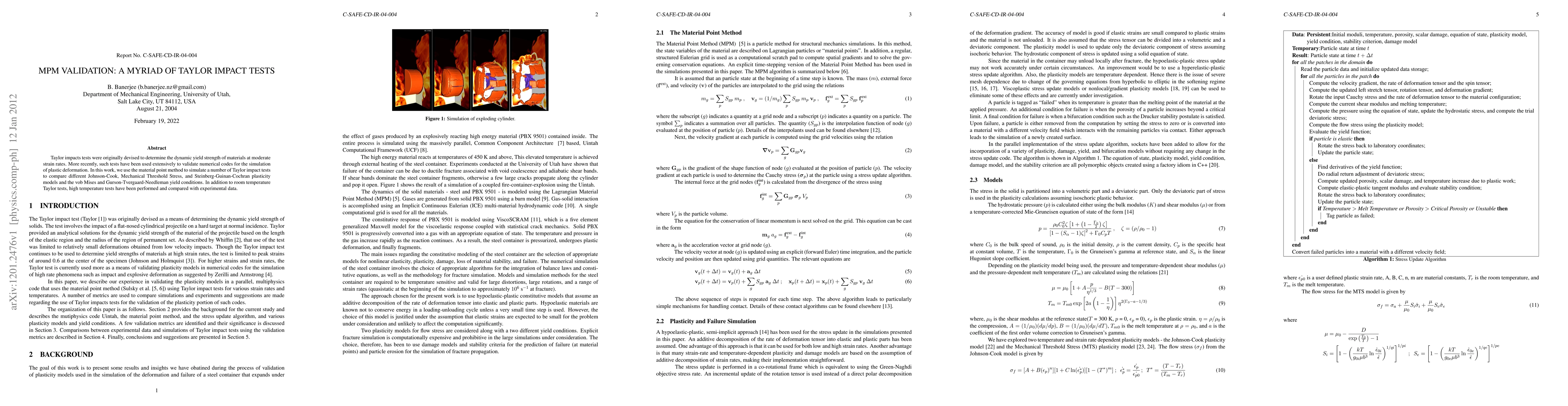 This study validates the material point method for simulating plastic deformation using Taylor impact tests, comparing various plasticity models and yield conditions against experimental data, including both room temperature and high-temperature conditions. The results aim to assess the accuracy of numerical simulations in predicting material behavior under dynamic loading.