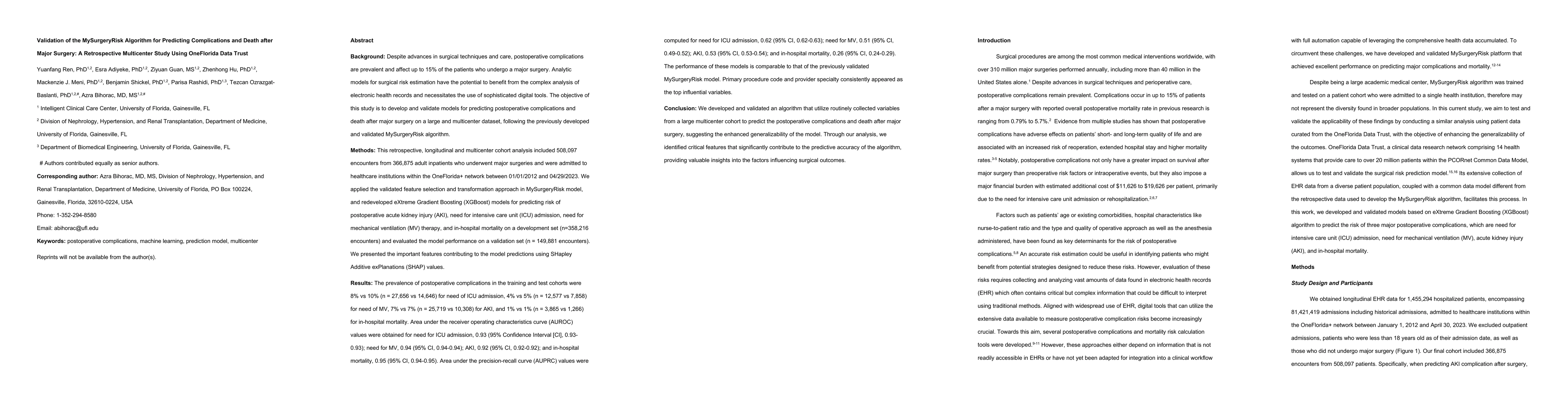 Despite advances in surgical techniques and care, postoperative complications are prevalent and effects up to 15% of the patients who underwent a major surgery. The objective of this study is to develop and validate models for predicting postoperative complications and death after major surgery on a large and multicenter dataset, following the previously validated MySurgeryRisk algorithm. This retrospective, longitudinal and multicenter cohort analysis included 508,097 encounters from 366,875 adult inpatients who underwent major surgeries and were admitted to healthcare institutions within the OneFlorida+ network between 01/01/2012 and 04/29/2023. We applied the validated feature selection and transformation approach in MySurgeryRisk models and redeveloped eXtreme Gradient Boosting (XGBoost) models for predicting risk of postoperative acute kidney injury (AKI), need for intensive care unit (ICU) admission, need for mechanical ventilation (MV) therapy and in-hospital mortality on a development set and evaluated the model performance on a validation set. Area under the receiver operating characteristics curve values were obtained for need for ICU admission, 0.93 (95% Confidence Interval [CI], 0.93-0.93); need for MV, 0.94 (95% CI, 0.94-0.94); AKI, 0.92 (95% CI, 0.92-0.92); and in-hospital mortality, 0.95 (95% CI, 0.94-0.95). Area under the precision-recall curve values were computed for need for ICU admission, 0.62 (95% CI, 0.62-0.63); need for MV, 0.51 (95% CI, 0.49-0.52); AKI, 0.53 (95% CI, 0.53-0.54); and in-hospital mortality, 0.26 (95% CI, 0.24-0.29). The performance of these models is comparable to that of the previously validated MySurgeryRisk models, suggesting the enhanced generalizability of the models. Primary procedure code and provider specialty consistently appeared as the top influential variables, providing valuable insights into the factors influencing surgical outcomes.