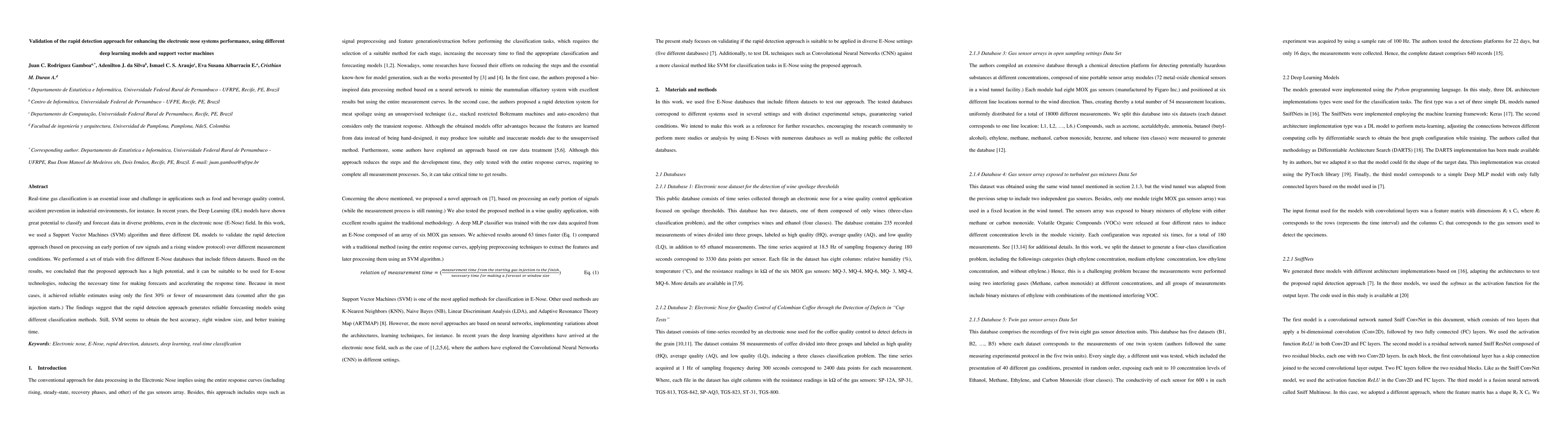 This paper validates a rapid detection approach for enhancing electronic nose systems using deep learning and support vector machines, showing that it can significantly reduce response time and improve accuracy by utilizing only the initial portion of raw signal data. Support Vector Machines achieved the best accuracy and training time among the tested methods.