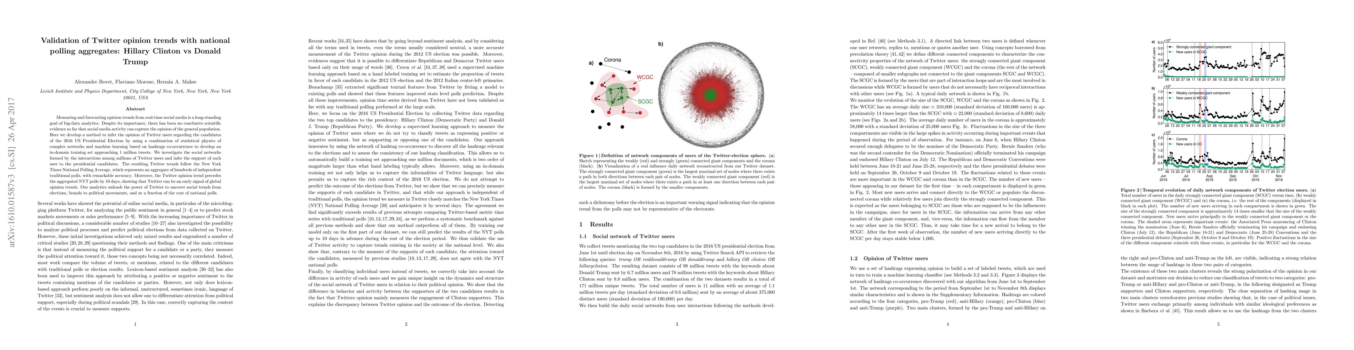 This study validates Twitter opinion trends against national polling aggregates for the 2016 US Presidential Election, demonstrating that Twitter can capture public opinion with remarkable accuracy and precede traditional polls by 10 days. The research combines statistical physics and machine learning to analyze millions of tweets, revealing Twitter's potential as a cost-effective early signal of global opinion trends.