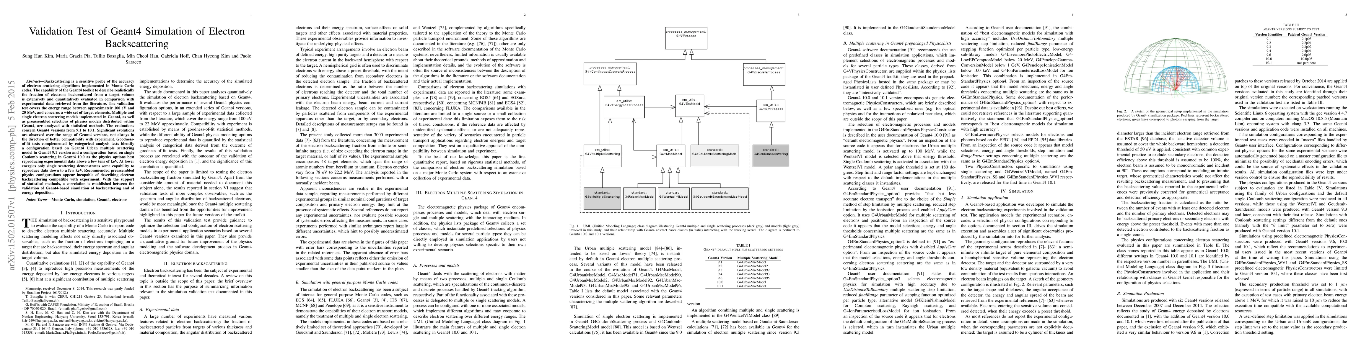 This paper validates Geant4's simulation of electron backscattering across various energies and target elements, comparing it to experimental data. The best configurations identified are Geant4 Urban model in version 9.1 and single Coulomb scattering in version 10.0, while preassembled physics configurations fall short.