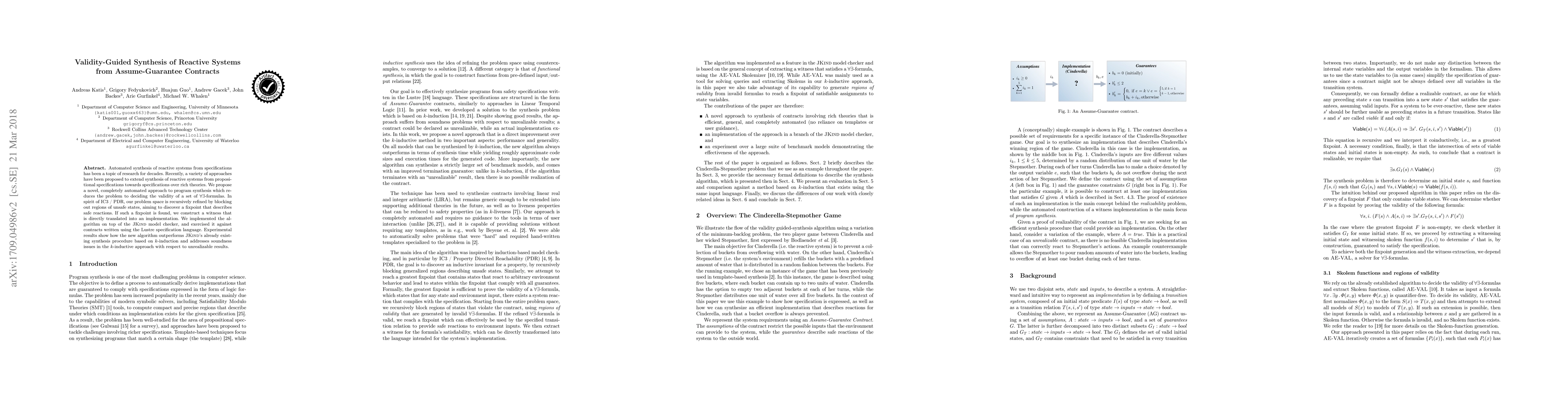 This paper presents an automated synthesis method for reactive systems from assume-guarantee contracts, reducing the problem to deciding the validity of forall-exists formulas. The algorithm recursively refines the problem space to find a safe fixpoint, outperforming existing methods based on k-induction.