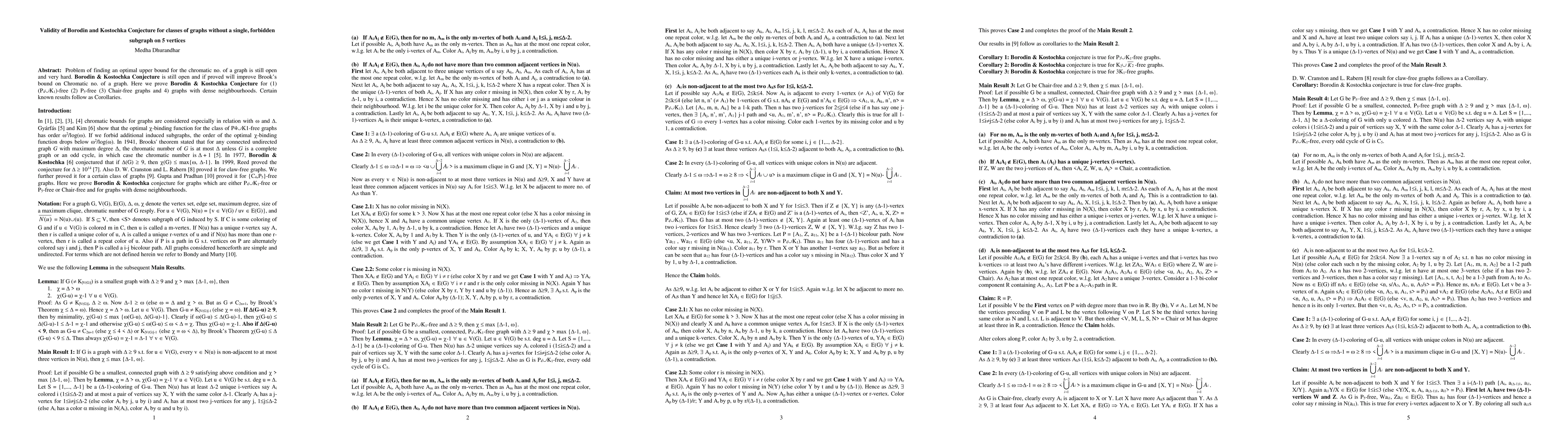 Summary: The paper proves the Borodin and Kostochka Conjecture for specific classes of graphs without any single forbidden subgraph on 5 vertices, including (P4 Union K1)-free, P5-free, Chair-free, and graphs with dense neighborhoods, thereby improving the Brook bound on the chromatic number. Known results are derived as corollaries.
