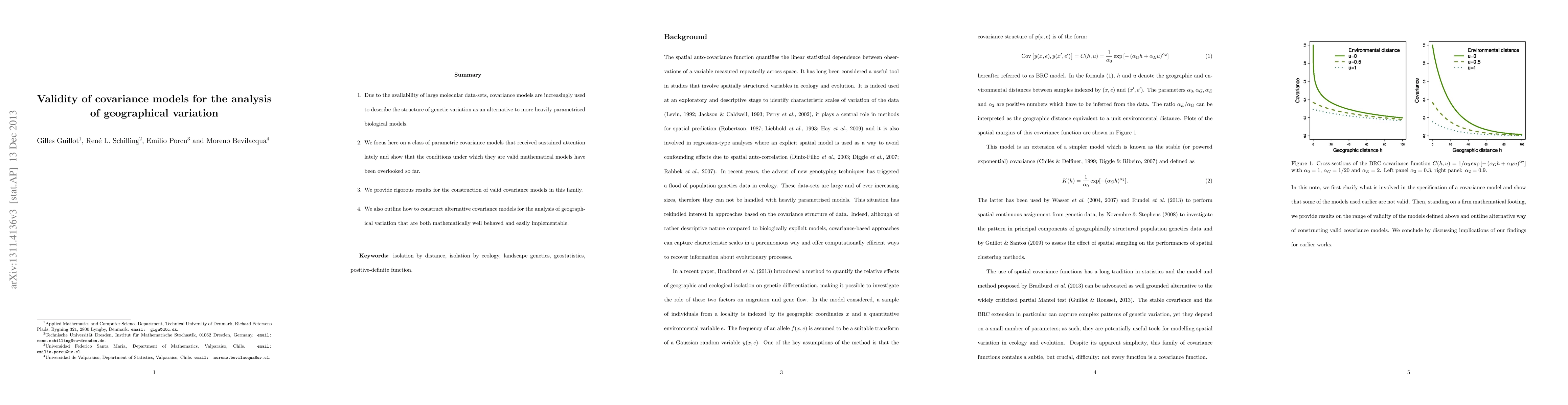 Due to the availability of large molecular data-sets, covariance models are increasingly used to describe the structure of genetic variation as an alternative to more heavily parametrised biological models. We focus here on a class of parametric covariance models that received sustained attention lately and show that the conditions under which they are valid mathematical models have been overlooked so far. We provide rigorous results for the construction of valid covariance models in this family. We also outline how to construct alternative covariance models for the analysis of geographical variation that are both mathematically well behaved and easily implementable.