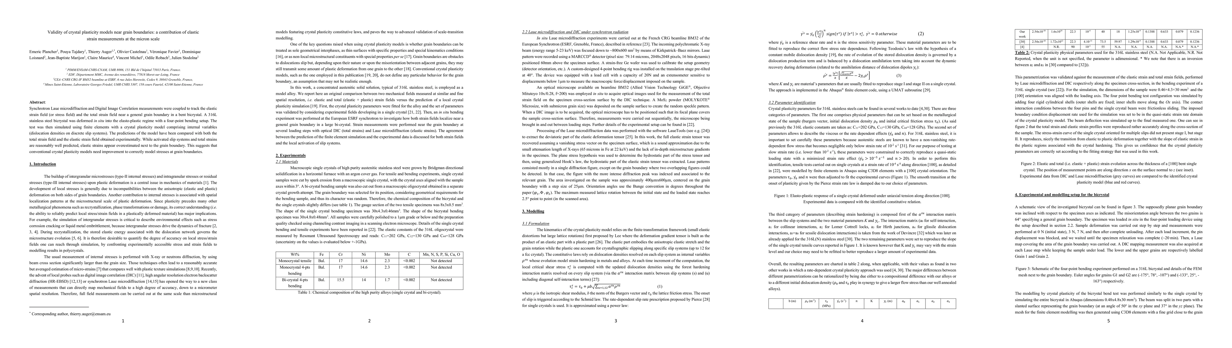 This study combines synchrotron Laue microdiffraction and Digital Image Correlation to measure strain fields near grain boundaries in a bent 316L stainless steel bicrystal. Finite element simulations using a crystal plasticity model show good agreement with total strain but overestimate elastic strains near grain boundaries, indicating the model's need for improvement.