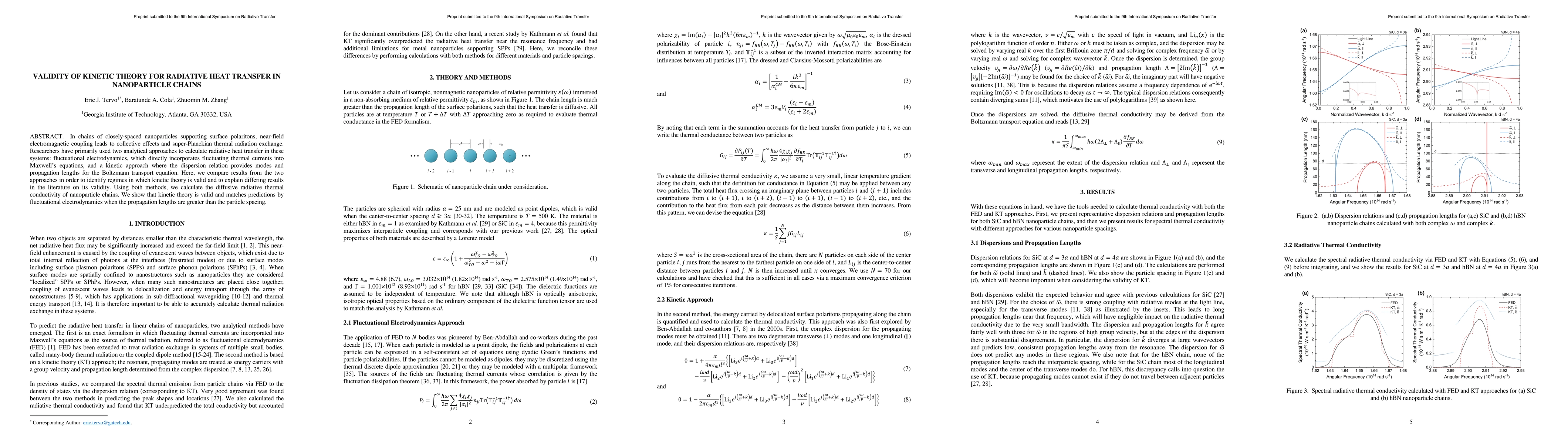 This study compares two methods for calculating heat transfer in chains of closely spaced nanoparticles, finding that kinetic theory is accurate when the energy propagation length exceeds the particle spacing. The results help clarify when simplified models can reliably predict radiative heat transfer in nanostructures.