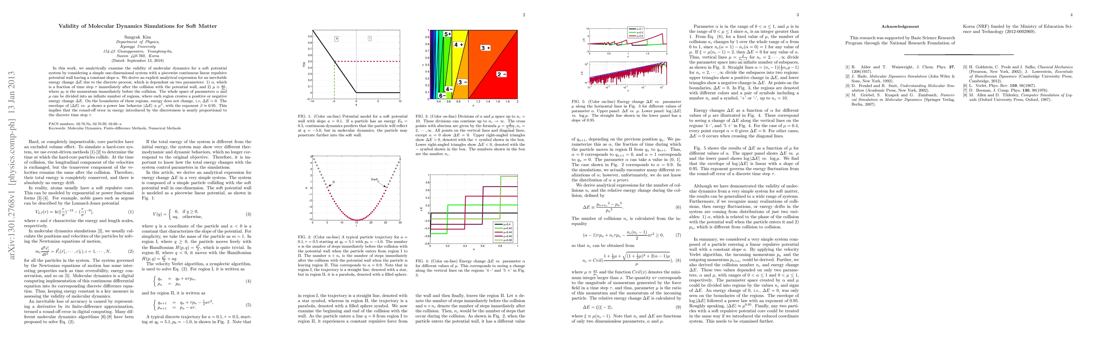 This study analytically validates molecular dynamics for soft matter systems using a one-dimensional model with a linear repulsive potential. It derives an expression for energy change u2018u delta Eu2019 due to discretization, dependent on parameters u2018u alphau2019 and u2018u muu2019. The results indicate that u delta Eu2019 follows a power law with respect to the time step, suggesting that energy errors are significantly influenced by the discretization interval.