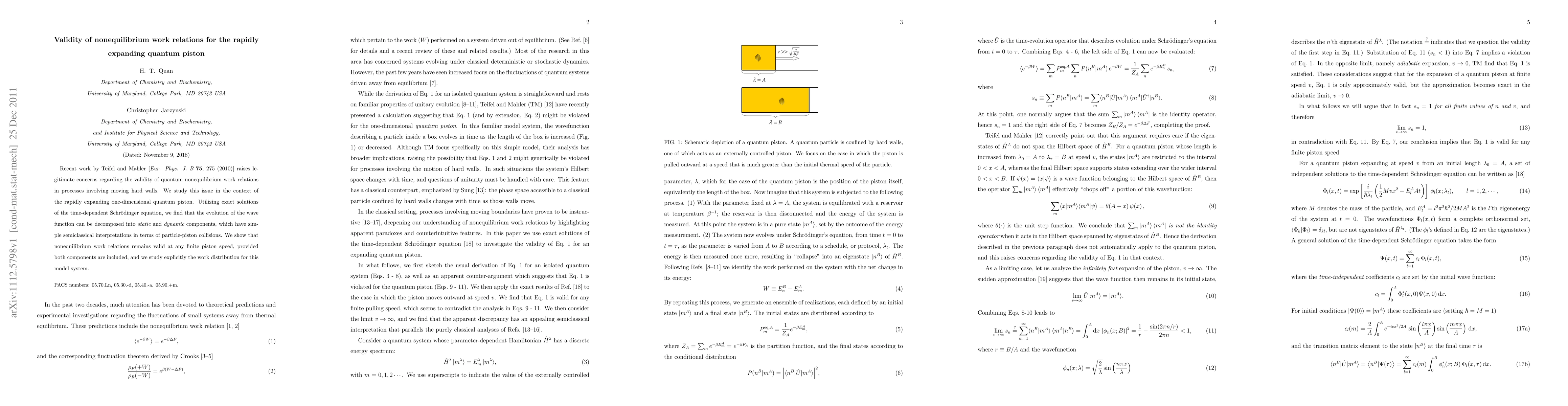 Recent work by Teifel and Mahler [Eur. Phys. J. B 75, 275 (2010)] raises legitimate concerns regarding the validity of quantum nonequilibrium work relations in processes involving moving hard walls. We study this issue in the context of the rapidly expanding one-dimensional quantum piston. Utilizing exact solutions of the time-dependent Schrodinger equation, we find that the evolution of the wave function can be decomposed into static and dynamic components, which have simple semiclassical interpretations in terms of particle-piston collisions. We show that nonequilibrium work relations remains valid at any finite piston speed, provided both components are included, and we study explicitly the work distribution for this model system.