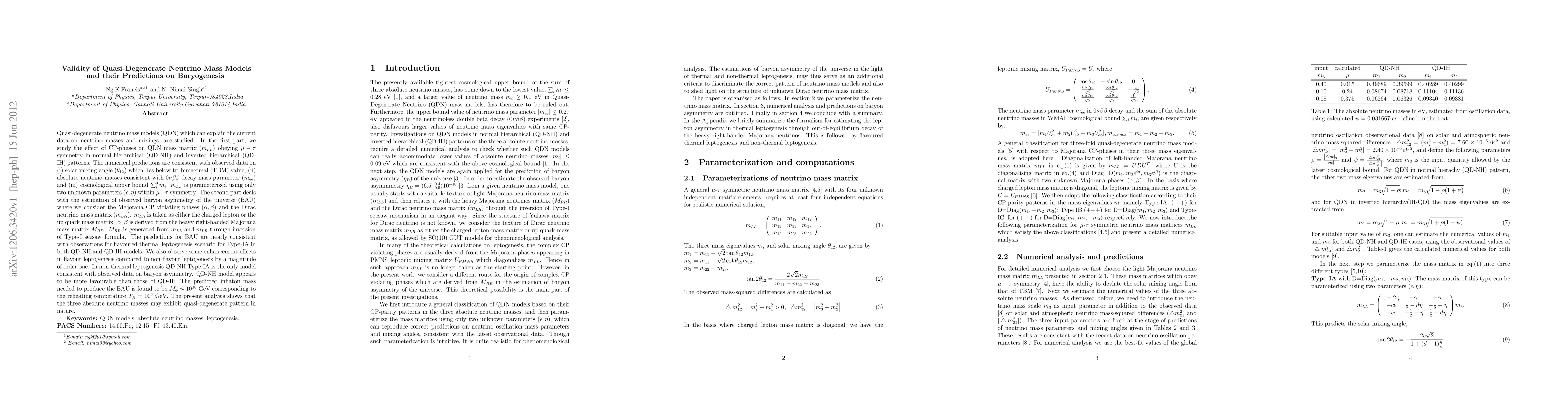 Quasi-degenerate neutrino mass models (QDN) which can explain the current data on neutrino masses and mixings,are studied. In the first part, we study the effect of CP-phases on QDN mass matrix obeying $\mu-\tau$ symmetry in normal hierarchical (QD-NH) and inverted hierarchical (QD-IH) patterns.The numerical predictions are consistent with observed data on solar mixing angle, absolute neutrino mass parameter consistent with neutrinoless double beta decay mass parameter and sum of three absolute neutrino masses from cosmological bound.The neutrino mass matrix is parameterized using only two unknown parameters. The second part deals with the estimation of observed baryon asymmetry of the universe. The prediction is nearly consistent with observation with flavoured thermal leptogenesis scenario. QD-NH model appears to be more favourable than those of QD-IH models.The present analysis shows that the three absolute neutrino masses may exhibit quasi-degenerate pattern in nature. They are far from discrimination at the moment.
