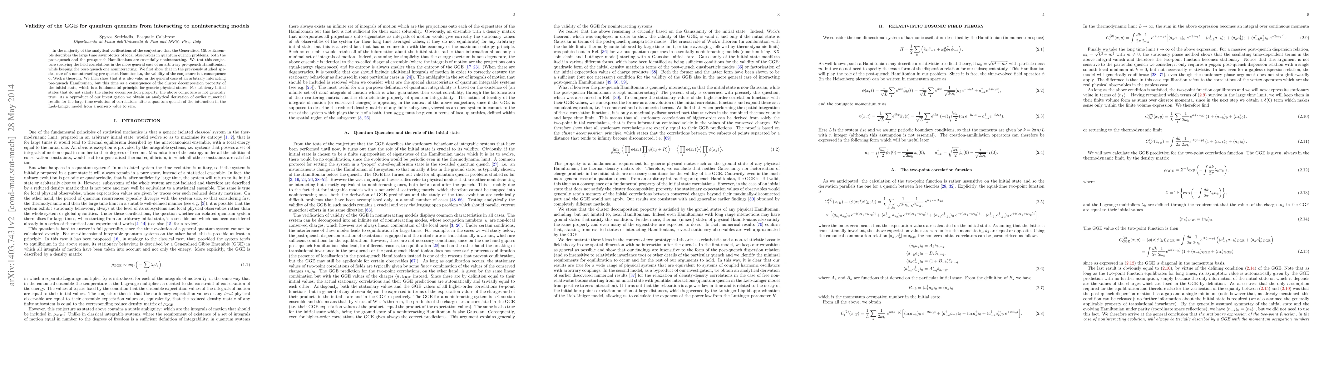 In the majority of the analytical verifications of the conjecture that the Generalised Gibbs Ensemble describes the large time asymptotics of local observables in quantum quench problems, both the post-quench and the pre-quench Hamiltonians are essentially noninteracting. We test this conjecture studying the field correlations in the more general case of an arbitrary pre-quench Hamiltonian, while keeping the post-quench one noninteracting. We first show that in the previously studied special case of a noninteracting pre-quench Hamiltonian, the validity of the conjecture is a consequence of Wick's theorem. We then show that it is also valid in the general case of an arbitrary interacting pre-quench Hamiltonian, but this time as a consequence of the cluster decomposition property of the initial state, which is a fundamental principle for generic physical states. For arbitrary initial states that do not satisfy the cluster decomposition property, the above conjecture is not generally true. As a byproduct of our investigation we obtain an analytical derivation of earlier numerical results for the large time evolution of correlations after a quantum quench of the interaction in the Lieb-Liniger model from a nonzero value to zero.