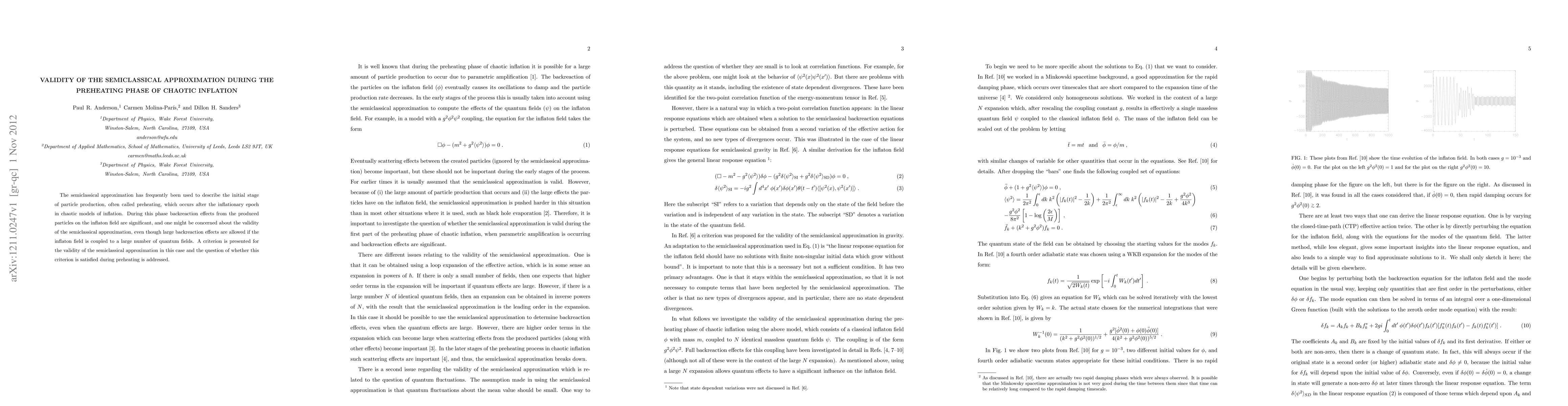 The semiclassical approximation has frequently been used to describe the initial stage of particle production, often called preheating, which occurs after the inflationary epoch in chaotic models of inflation. During this phase backreaction effects from the produced particles on the inflaton field are significant, and one might be concerned about the validity of the semiclassical approximation, even though large backreaction effects are allowed if the inflaton field is coupled to a large number of quantum fields. A criterion is presented for the validity of the semiclassical approximation in this case and the question of whether this criterion is satisfied during preheating is addressed.