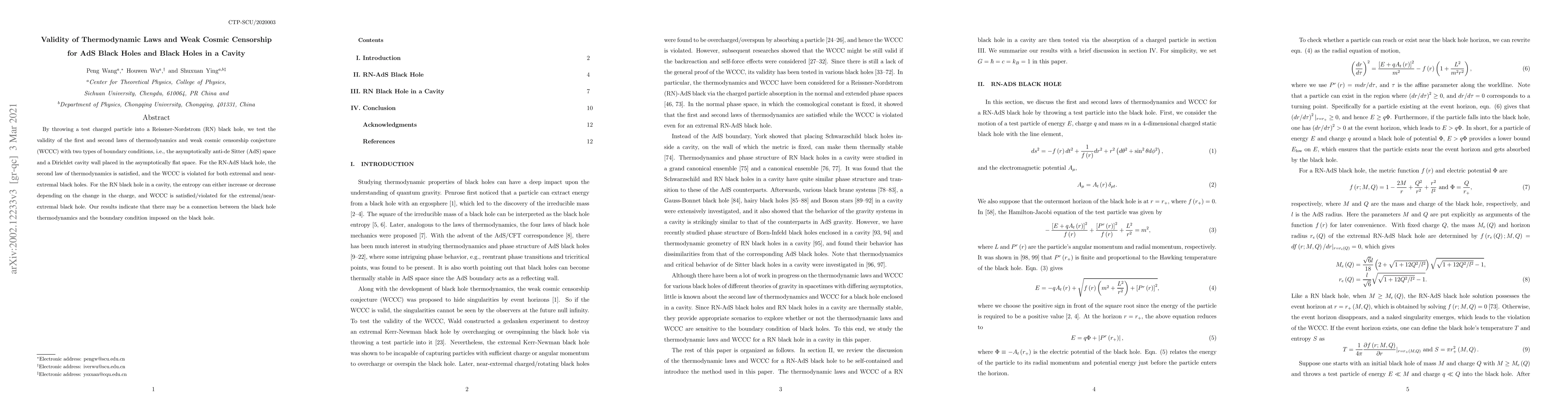 By throwing a test charged particle into a Reissner-Nordstrom (RN) black hole, we test the validity of the first and second laws of thermodynamics and weak cosmic censorship conjecture (WCCC) with two types of boundary conditions, i.e., the asymptotically anti-de Sitter (AdS) space and a Dirichlet cavity wall placed in the asymptotically at space. For the RN-AdS black hole, the second law of thermodynamics is satisfied, and the WCCC is violated for both extremal and nearextremal black holes. For the RN black hole in a cavity, the entropy can either increase or decrease depending on the change in the charge, and WCCC is satisfied/violated for the extremal/nearextremal black hole. Our results indicate that there may be a connection between the black hole thermodynamics and the boundary condition imposed on the black hole.