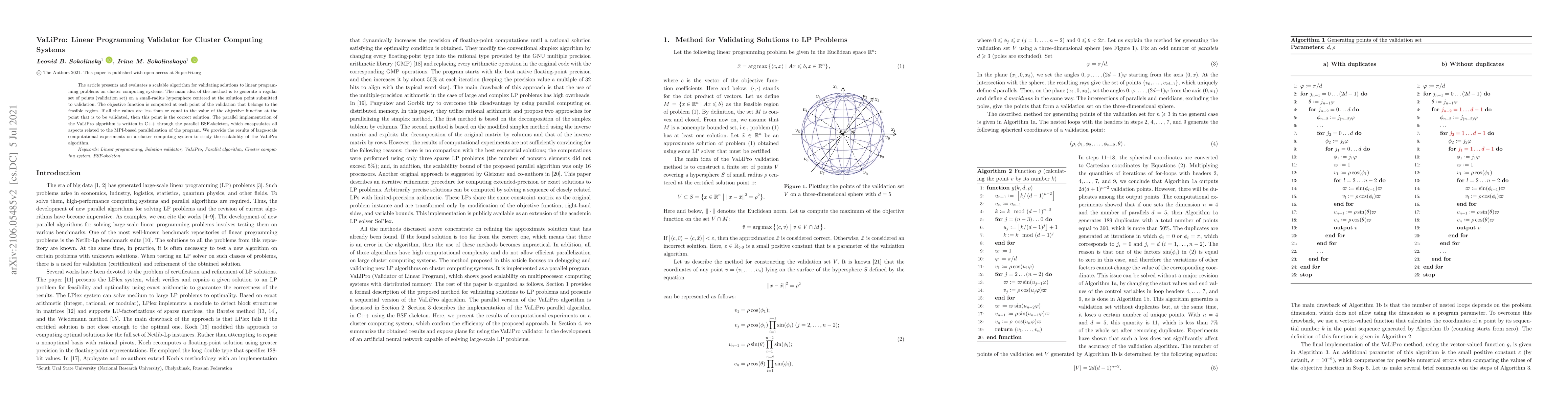 The VaLiPro algorithm validates solutions of linear programming problems on cluster systems by generating a validation set on a hypersphere around the solution. The algorithm's scalability and effectiveness are demonstrated through parallel implementation in C++ and extensive computational experiments on a cluster.
