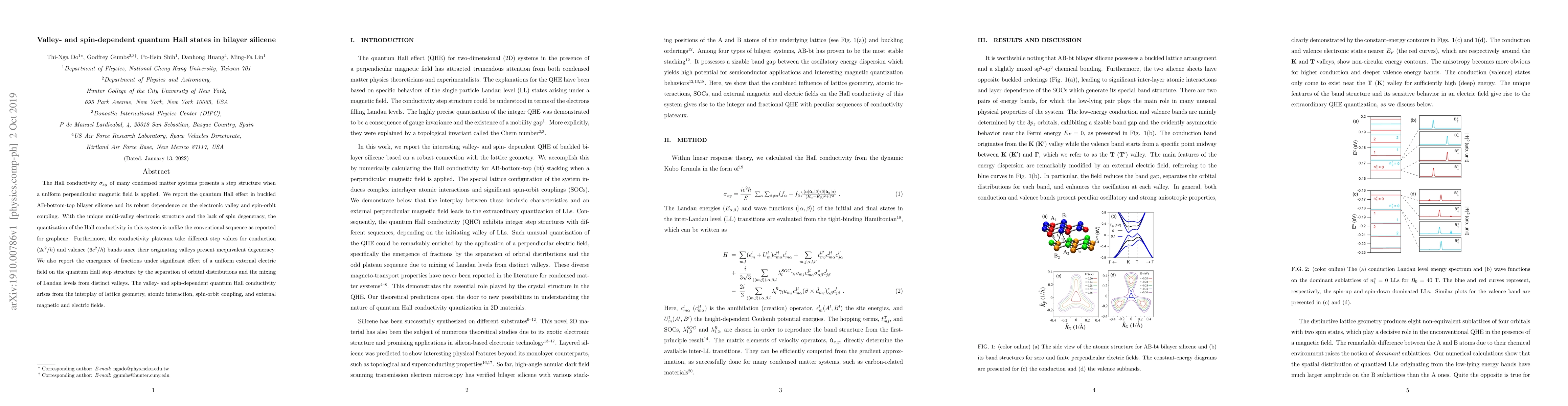 This paper investigates the quantum Hall effect in bilayer silicene, revealing its unique dependence on electronic valleys and spin-orbit coupling, resulting in distinct Hall conductivity plateaus for conduction and valence bands. The study also highlights the influence of external electric fields on altering the quantum Hall step structure through valley mixing.