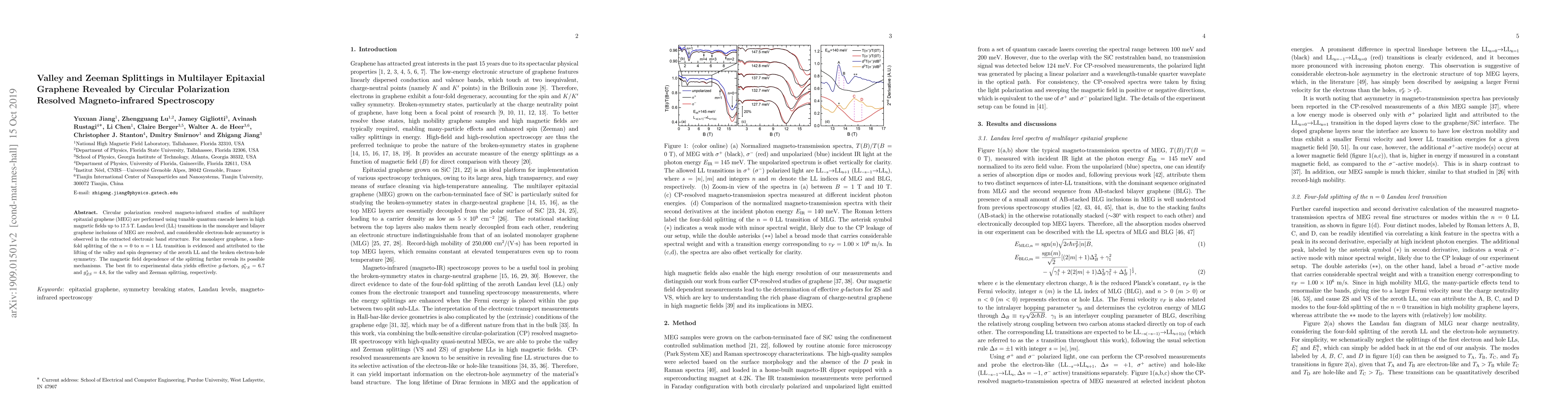 This study reveals valley and Zeeman splittings in multilayer epitaxial graphene using circular polarization resolved magneto-infrared spectroscopy, showing electron-hole asymmetry and a four-fold splitting in the $n=0$ to $n=1$ Landau level transition due to valley and spin degeneracy lifting, with effective $g$-factors of $g^*_{VS}=6.7$ and $g^*_{ZS}=4.8$.