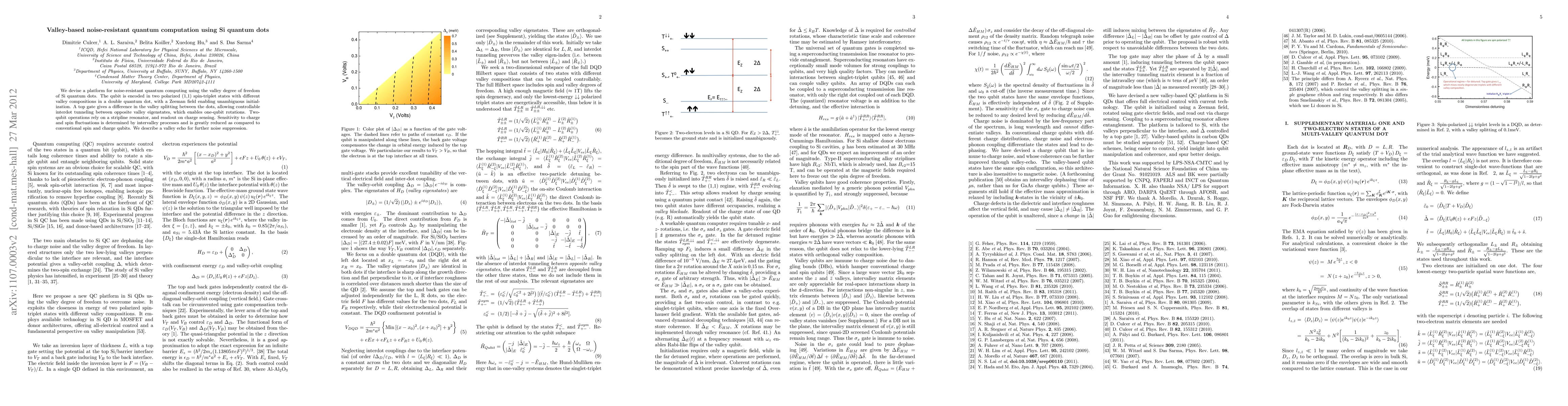 This paper proposes a noise-resistant quantum computing platform using Si quantum dots, where qubits are encoded in spin-triplet states with distinct valley compositions. It leverages valley splitting and interdot tunneling for qubit manipulation, employing stripline resonators for two-qubit operations and charge sensing for readout, while significantly reducing sensitivity to charge and spin fluctuations through intervalley processes.