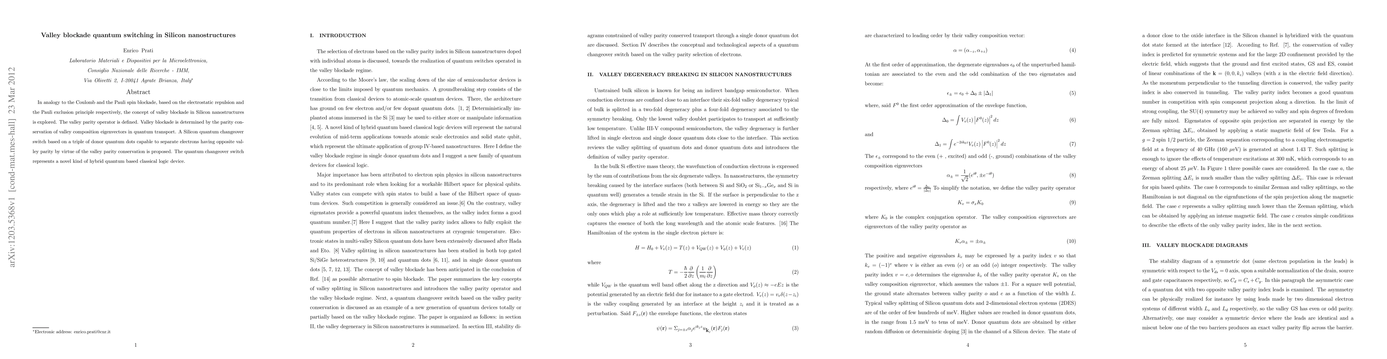 In analogy to the Coulomb and the Pauli spin blockade, based on the electrostatic repulsion and the Pauli exclusion principle respectively, the concept of valley blockade in Silicon nanostructures is explored. The valley parity operator is defined. Valley blockade is determined by the parity conservation of valley composition eigenvectors in quantum transport. A Silicon quantum changeover switch based on a triple of donor quantum dots capable to separate electrons having opposite valley parity by virtue of the valley parity conservation is proposed. The quantum changeover switch represents a novel kind of hybrid quantum based classical logic device.