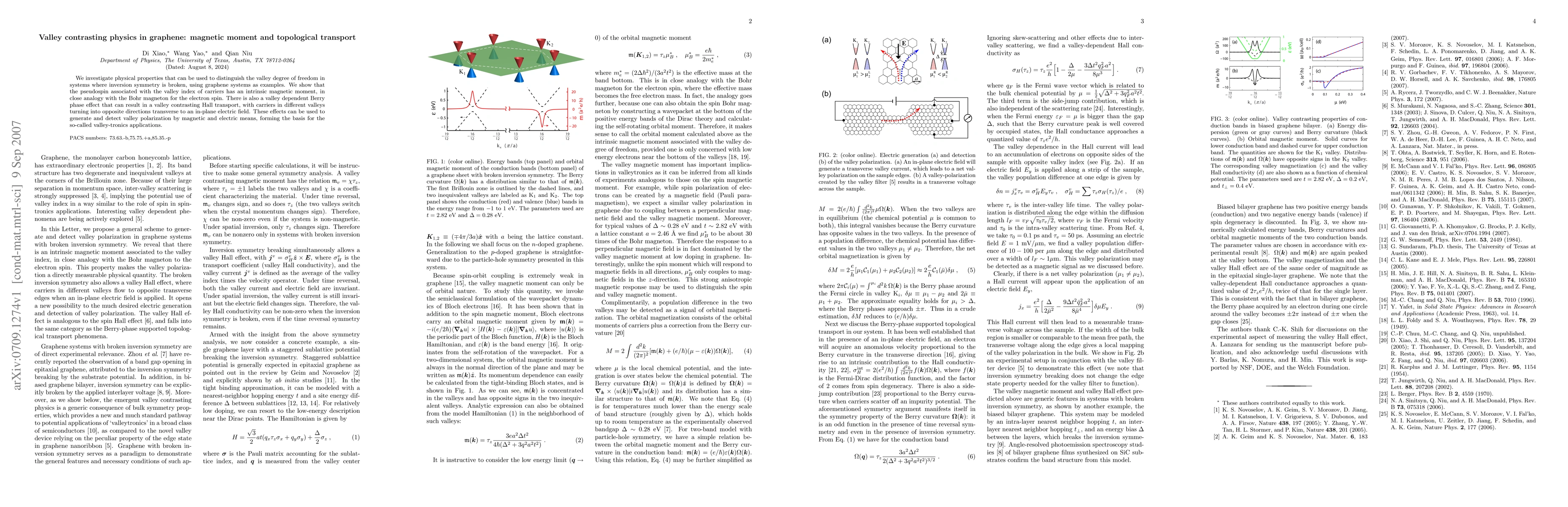 This study explores graphene systems to distinguish valley degrees of freedom, demonstrating that carriers' pseudospin has an intrinsic magnetic moment and a valley-dependent Berry phase causing opposite valley contrasting Hall transport. These effects form the foundation for valley-tronics applications.