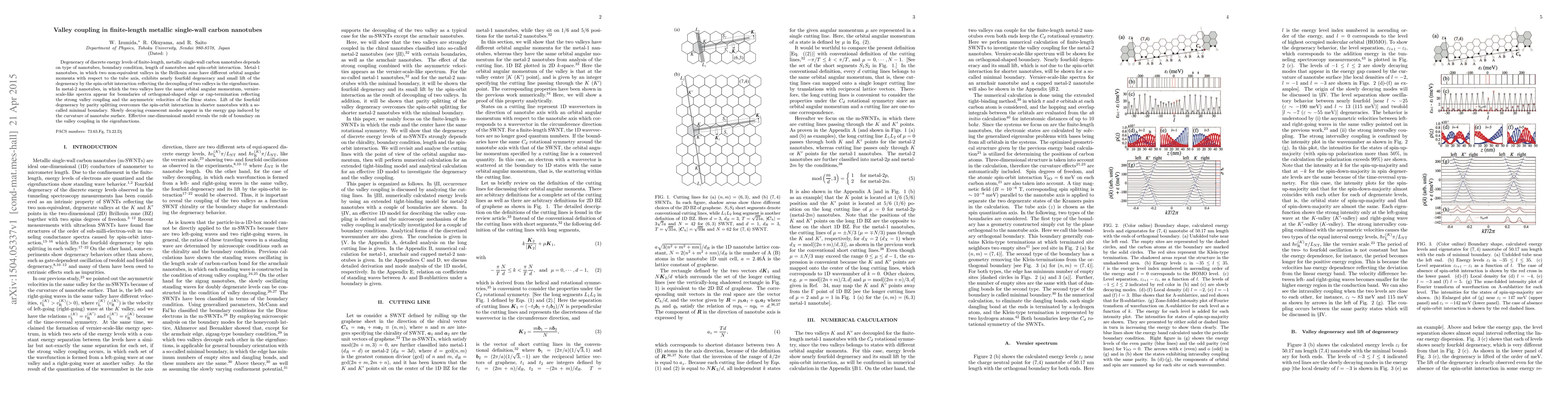 Degeneracy of discrete energy levels of finite-length, metallic single-wall carbon nanotubes depends on type of nanotubes, boundary condition, length of nanotubes and spin-orbit interaction. Metal-1 nanotubes, in which two non-equivalent valleys in the Brillouin zone have different orbital angular momenta with respect to the tube axis, exhibits nearly fourfold degeneracy and small lift of the degeneracy by the spin-orbit interaction reflecting the decoupling of two valleys in the eigenfunctions. In metal-2 nanotubes, in which the two valleys have the same orbital angular momentum, vernier-scale-like spectra appear for boundaries of orthogonal-shaped edge or cap-termination reflecting the strong valley coupling and the asymmetric velocities of the Dirac states. Lift of the fourfold degeneracy by parity splitting overcomes the spin-orbit interaction in shorter nanotubes with a so-called minimal boundary. Slowly decaying evanescent modes appear in the energy gap induced by the curvature of nanotube surface. Effective one-dimensional model reveals the role of boundary on the valley coupling in the eigenfunctions.