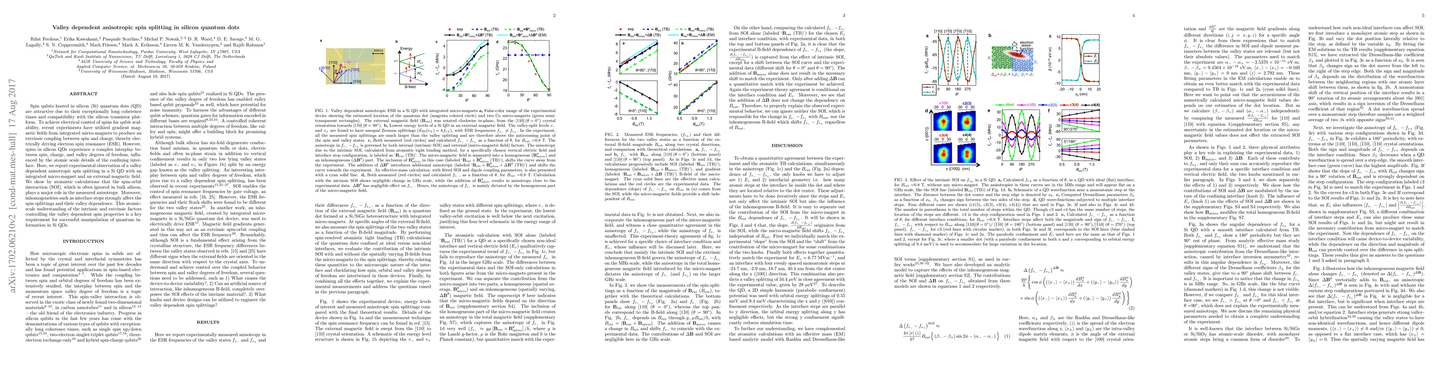This study experimentally observes valley dependent anisotropic spin splitting in silicon quantum dots, revealing the significant role of spin-orbit interaction and interface inhomogeneities in controlling these properties, essential for manipulating quantum information in silicon qubits.