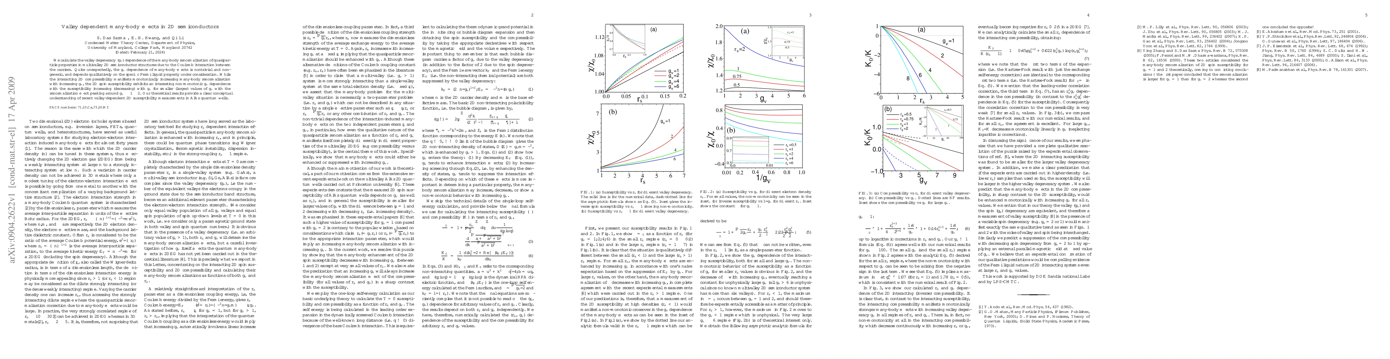 We calculate the valley degeneracy ($g_v$) dependence of the many-body renormalization of quasiparticle properties in multivalley 2D semiconductor structures due to the Coulomb interaction between the carriers. Quite unexpectedly, the $g_v$ dependence of many-body effects is nontrivial and non-generic, and depends qualitatively on the specific Fermi liquid property under consideration. While the interacting 2D compressibility manifests monotonically increasing many-body renormalization with increasing $g_v$, the 2D spin susceptibility exhibits an interesting non-monotonic $g_v$ dependence with the susceptibility increasing (decreasing) with $g_v$ for smaller (larger) values of $g_v$ with the renormalization effect peaking around $g_v\sim 1-2$. Our theoretical results provide a clear conceptual understanding of recent valley-dependent 2D susceptibility measurements in AlAs quantum wells.