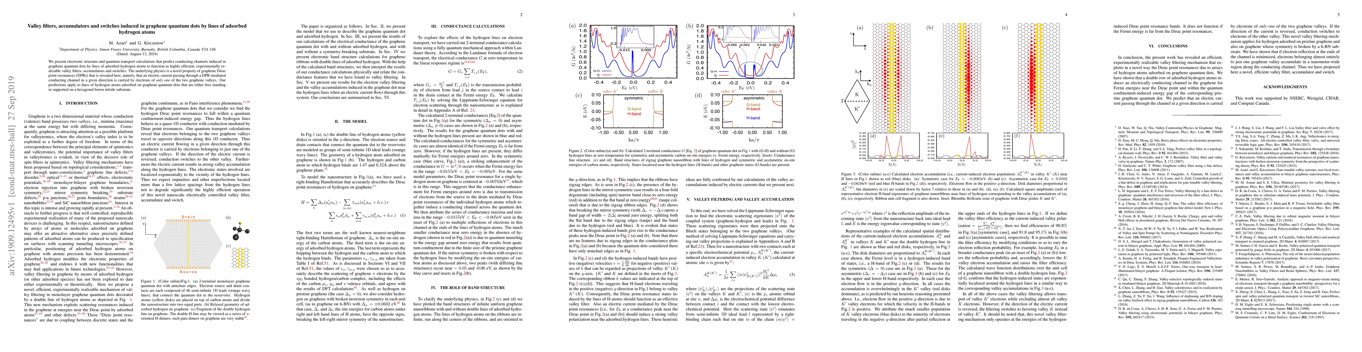 We present electronic structure and quantum transport calculations that predict conducting channels induced in graphene quantum dots by lines of adsorbed hydrogen atoms to function as highly efficient, experimentally realizable valley filters, accumulators and switches. The underlying physics is a novel property of graphene Dirac point resonances (DPRs) that is revealed here, namely, that an electric current passing through a DPR-mediated conducting channel in a given direction is carried by electrons of em only one of the two graphene valleys. Our predictions apply to lines of hydrogen atoms adsorbed on graphene quantum dots that are either free standing or supported on a hexagonal boron nitride substrate.