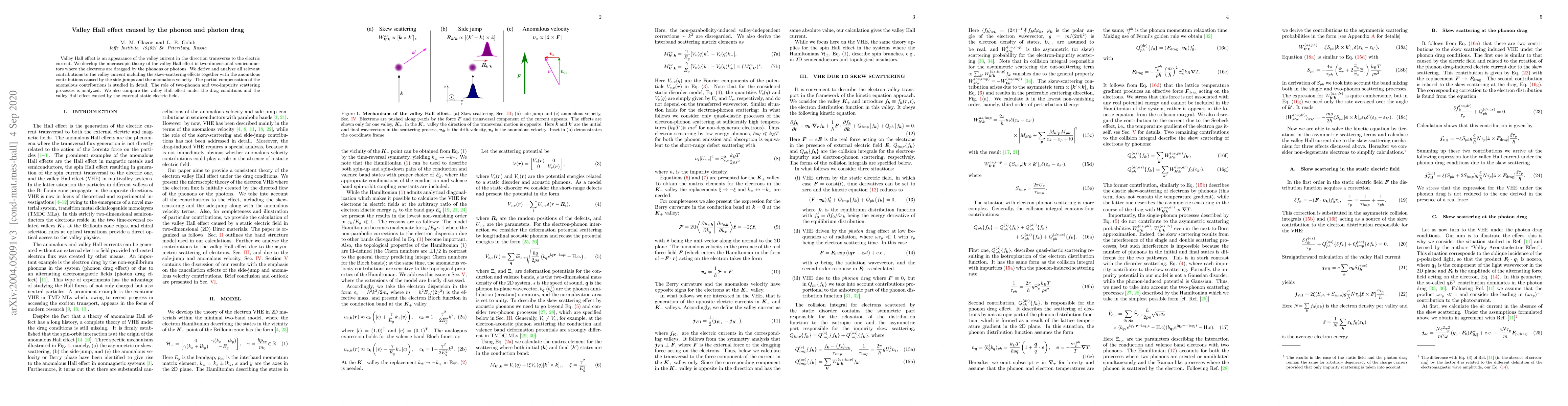 The paper develops a microscopic theory for the valley Hall effect in two-dimensional semiconductors driven by phonon or photon drag, analyzing contributions from skew-scattering, side-jumps, and anomalous velocity, and comparing it to the effect caused by an external electric field. The study focuses on the interplay between phonon and photon interactions in inducing valley currents.
