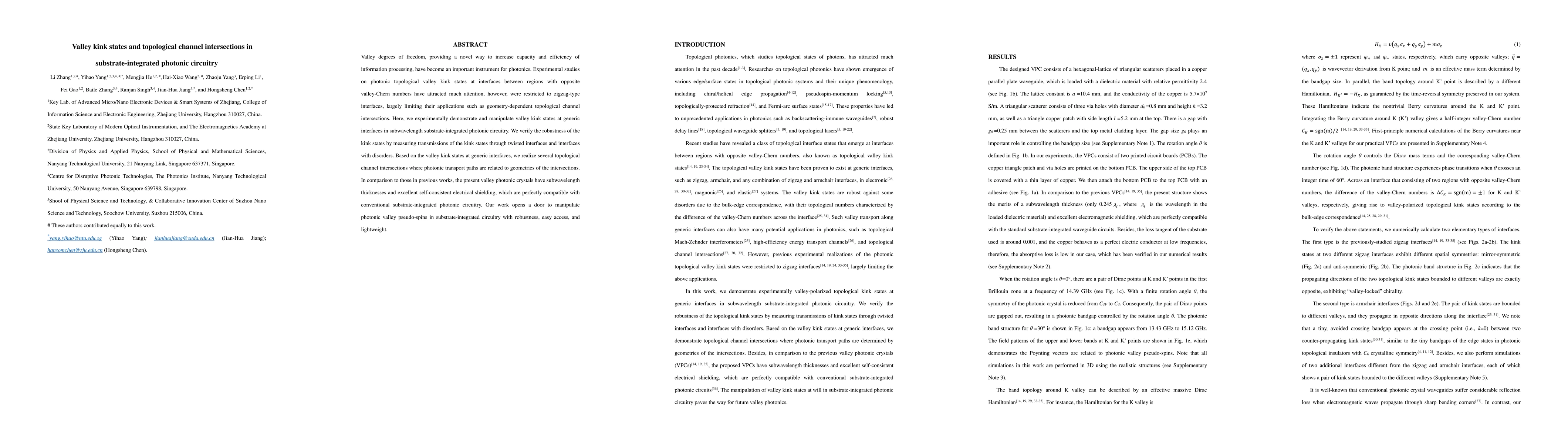 This research demonstrates experimental manipulation of valley kink states at generic interfaces in subwavelength substrate-integrated photonic circuitry, showing robust transmissions through twisted and disordered interfaces. The study enables topological channel intersections with photonic transport paths dependent on intersection geometries, offering a lightweight, self-consistent solution for photonic information processing.