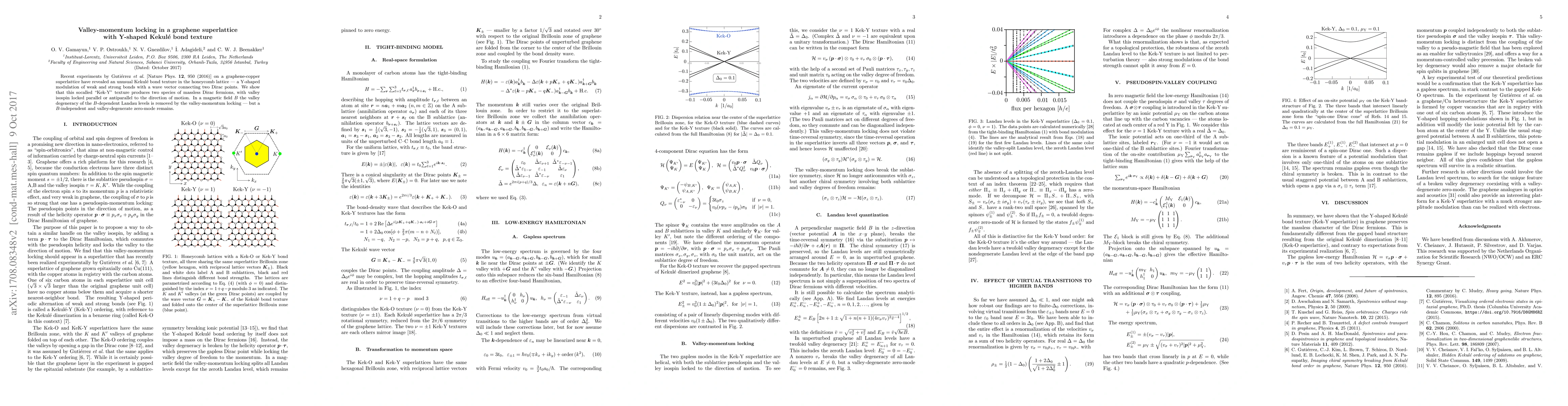 Recent experiments by Guti\'errez $\textit{et al.}$ [Nature Phys. $\textbf{12}$, 950 (2016)] on a graphene-copper superlattice have revealed an unusual Kekul\'e bond texture in the honeycomb lattice --- a Y-shaped modulation of weak and strong bonds with a wave vector connecting two Dirac points. We show that this so-called "Kek-Y" texture produces two species of massless Dirac fermions, with valley isospin locked parallel or antiparallel to the direction of motion. In a magnetic field $B$ the valley degeneracy of the $B$-dependent Landau levels is removed by the valley-momentum locking --- but a $B$-independent and valley-degenerate zero-mode remains.