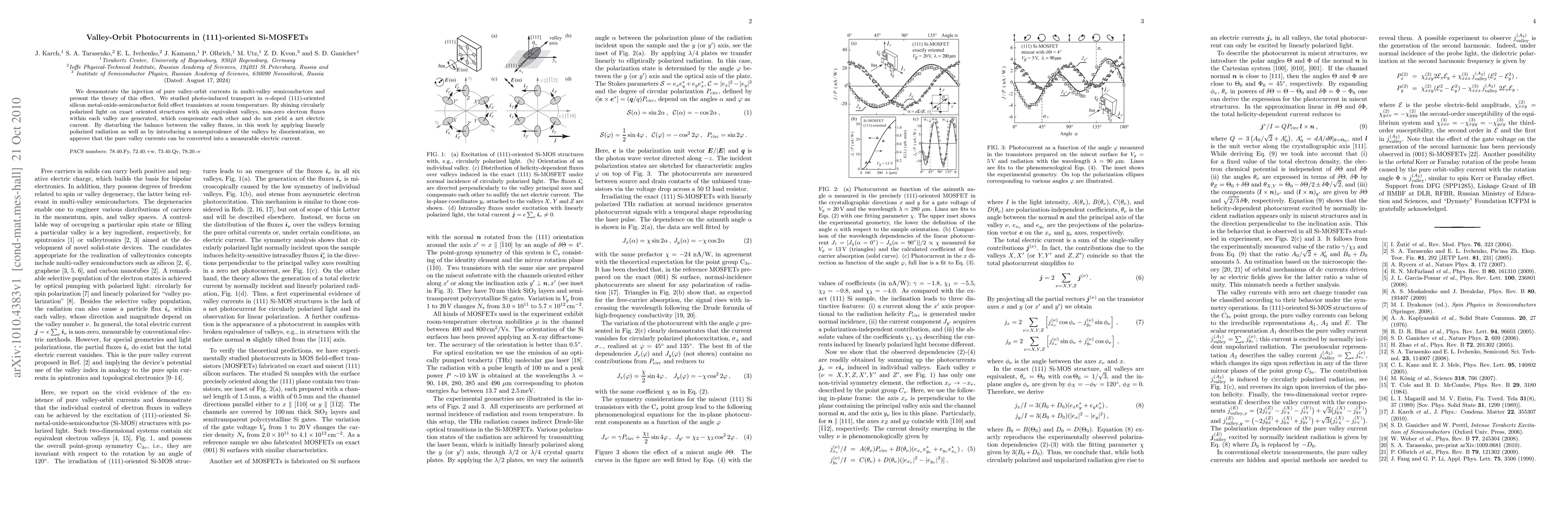 We demonstrate the injection of pure valley-orbit currents in multi-valley semiconductors and present the theory of this effect. We studied photo-induced transport in $n$-doped (111)-oriented silicon metal-oxide-semiconductor field effect transistors at room temperature. By shining circularly polarized light on exact oriented structures with six equivalent valleys, non-zero electron fluxes within each valley are generated, which compensate each other and do not yield a net electric current. By disturbing the balance between the valley fluxes, in this work by applying linearly polarized radiation as well as by introducing a nonequivalence of the valleys by disorientation, we approve that the pure valley currents can be converted into a measurable electric current.