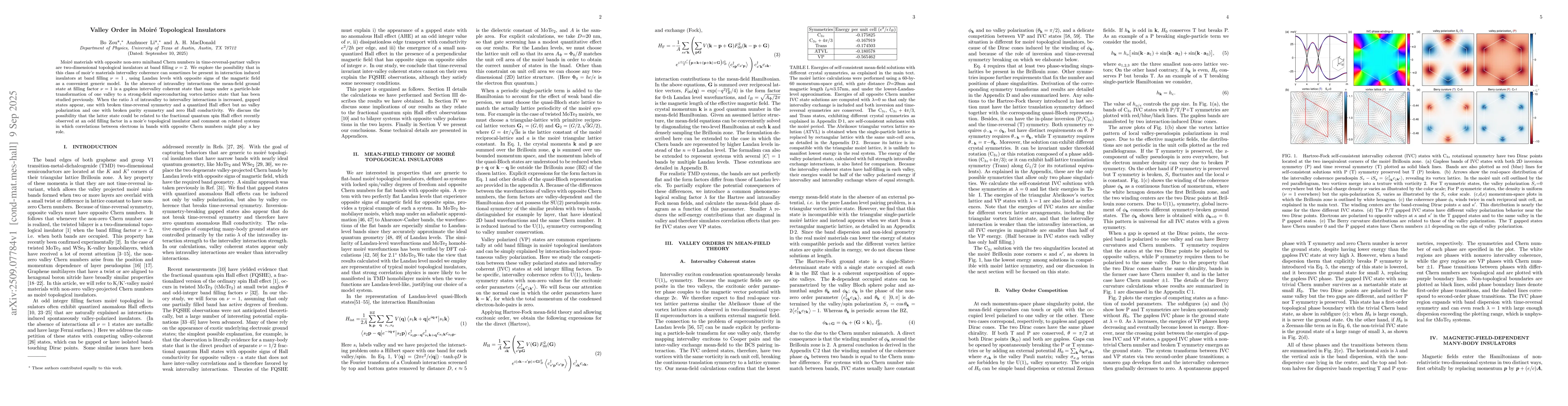 Moir\'e materials with opposite non-zero miniband Chern numbers in time-reversal-partner valleys are two-dimensional topological insulators at band filling $\nu=2$. We explore the possibility that in this class of moir'e materials intervalley coherence can sometimes be present in interaction induced insulators at band filling $\nu=1$ , using Landau levels with opposite signs of the magnetic field as a convenient generic model. In the absence of intravalley interactions the mean-field ground state at filling factor $\nu=1$ is a gapless intervalley coherent state that maps under a particle-hole transformation of one valley to a strong-field superconducting vortex-lattice state that has been studied previously. When the ratio $\lambda$ of intravalley to intervalley interactions is increased, gapped states appear, one with broken time-reversal symmetry and a quantized Hall effect but no valley polarization and one with broken parity symmetry and zero Hall conductivity. We discuss the possibility that the latter state could be related to the fractional quantum spin Hall effect recently observed at an odd filling factor in a moir'e topological insulator and comment on related systems in which correlations between electrons in bands with opposite Chern numbers might play a key role.