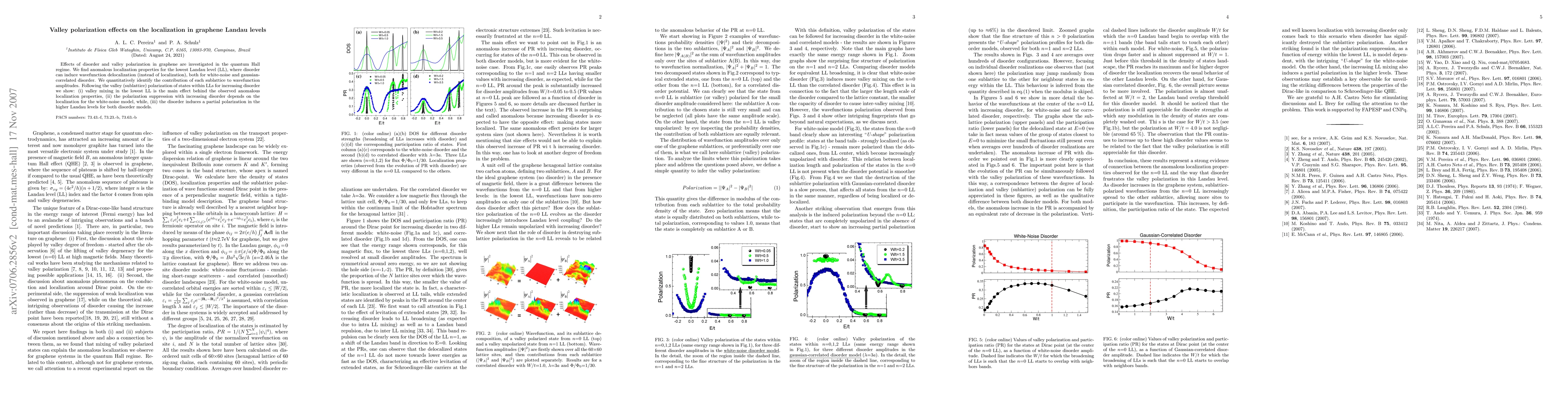 Effects of disorder and valley polarization in graphene are investigated in the quantum Hall regime. We find anomalous localization properties for the lowest Landau level (LL), where disorder can induce wavefunction delocalization (instead of localization), both for white-noise and gaussian-correlated disorder. We quantitatively identify the contribution of each sublattice to wavefunction amplitudes. Following the valley (sublattice) polarization of states within LLs for increasing disorder we show: (i) valley mixing in the lowest LL is the main effect behind the observed anomalous localization properties, (ii) the polarization suppression with increasing disorder depends on the localization for the white-noise model, while, (iii) the disorder induces a partial polarization in the higher Landau levels for both disorder models.