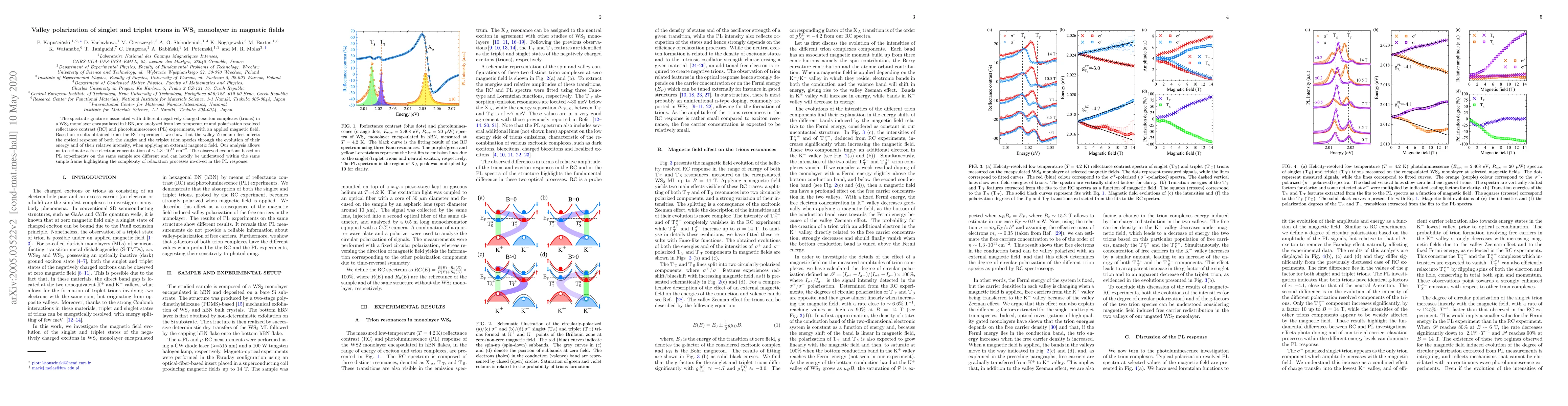 The spectral signatures associated with different negatively charged exciton complexes (trions) in a WS$_2$ monolayer encapsulated in hBN, are analyzed from low temperature and polarization resolved reflectance contrast (RC) and photoluminescence (PL) experiments, with an applied magnetic field. Based on results obtained from the RC experiment, we show that the valley Zeeman effect affects the optical response of both the singlet and the triplet trion species through the evolution of their energy and of their relative intensity, when applying an external magnetic field. Our analysis allows us to estimate a free electron concentration of $\sim 1.3 \cdot 10^{11}$ cm$^{-2}$. The observed evolutions based on PL experiments on the same sample are different and can hardly be understood within the same simple frame highlighting the complexity of relaxation processes involved in the PL response.