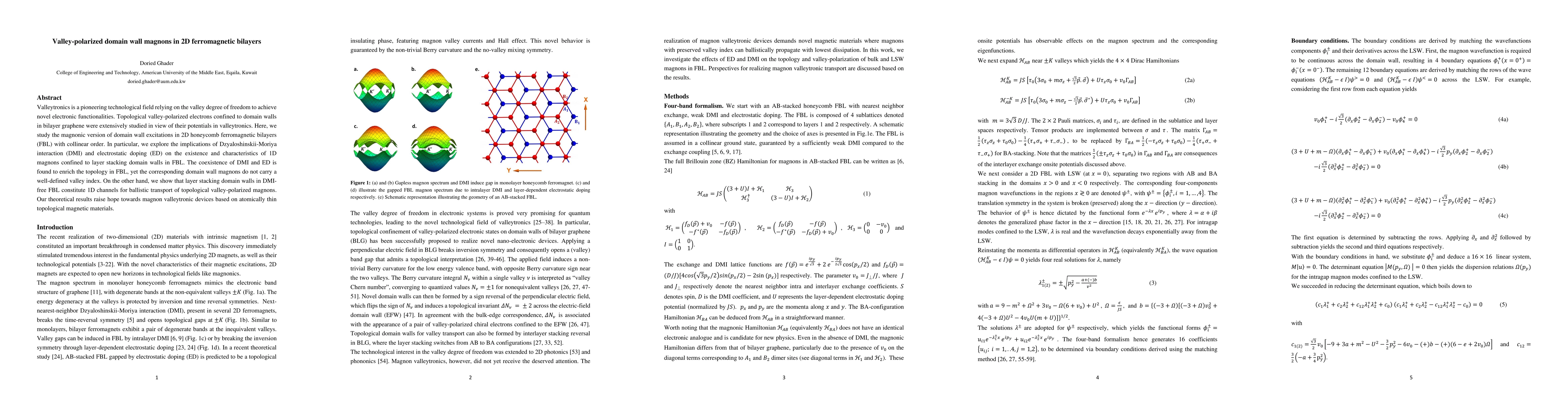 This paper explores magnonic domain wall excitations in 2D ferromagnetic bilayers, focusing on the effects of Dzyaloshinskii-Moriya interaction and electrostatic doping. It finds that while DMI and doping enrich the topological properties, they do not define a valley index for domain wall magnons, but DMI-free bilayers can host ballistic transport of valley-polarized magnons, suggesting potential for magnon valleytronic devices.